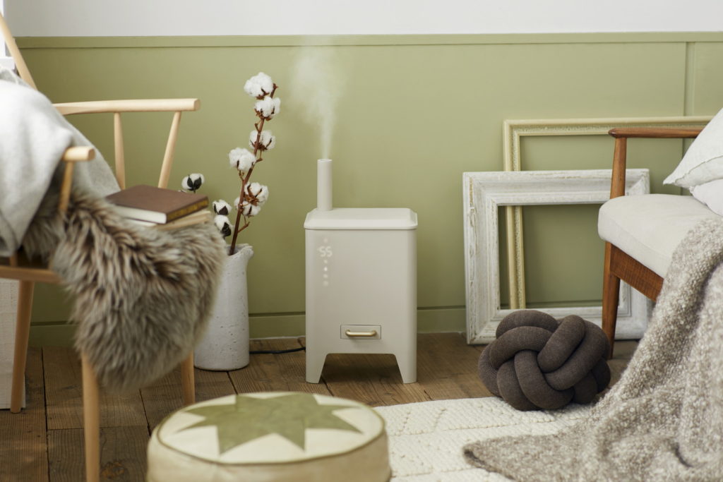 薪ストーブをモチーフにしたぬくもりを感じるデザインが特徴。加熱ヒーター、UVライト、イオン交換樹脂フィルターを通したミストが心地良い空間をつくりだします。ミストの量は4段階で調節可能。加湿をしながら香りが楽しめるアロマパッド付き。