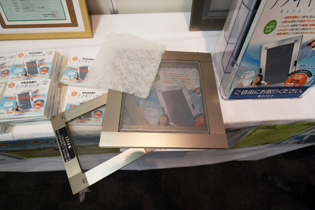このほか、あまり知られていないところでは、サンエスの空気清浄網戸、帝人フロンティアの花粉対策衣類繊維が認証を受けています。サンエスの網戸「ナノキャッチ」はネットとネットの間にフィルターを挟んだ3層構造の網戸です。外側のネットは隙間0.6mm以下でヒバ由来の忌避剤を浸透させているので微小昆虫が侵入できず、撥水性もあるので雨も弾きます。間に挟むフィルターにより花粉の捕集率は98.2%と、ほとんど花粉を通さないとのこと。ホコリも通しません。風の通過率は57%と、網戸本来の風通し機能も確保しています。