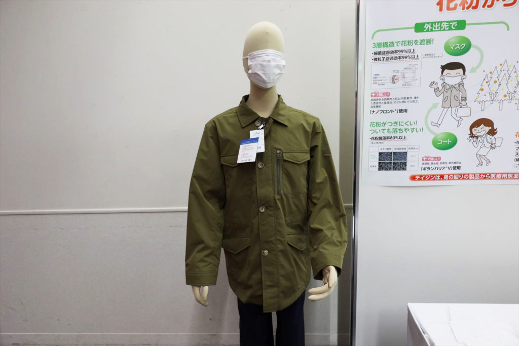 帝人フロンティアの「ポランバリア」は、花粉よりも細い繊維を使用し、凹凸ができるだけ少ない方法で縦糸と横糸を緻密に織ることで花粉が落下しやすく、隙間から花粉が侵入しにくい生地です。今年初めてクロコダイルブランドがスプリングコートで採用し、販売を開始しました。外出から帰ってきて、家に入る前に玄関前で軽く払えば表面の花粉が落ち、家の中への花粉の持ち込みを減らすことができます。