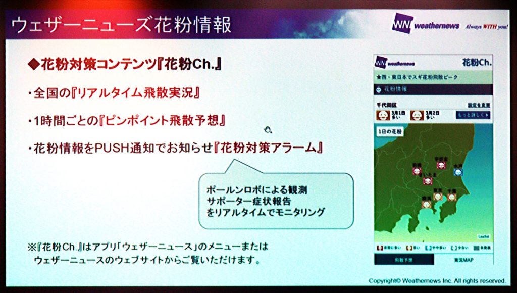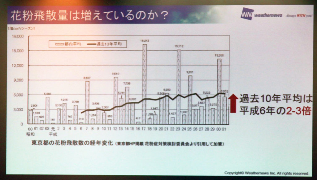 こうした花粉飛散情報をもとに、家庭内や外出時に自衛する必要があるわけですが、花粉対策グッズを選ぶ際に「JAPOC」マークが一つの判断基準になります。家電メーカーや繊維メーカー、製薬会社、研究機関などが参加する「花粉問題対策事業者協議会(JAPOC)」では、独自の試験方法に基づく性能測定を行い、自主認証基準に満たした製品に対して「JAPOC」認証の授与を行っています。家電製品では現在、象印マホービンやダイソン、パナソニック、ダイキンの空気清浄機が認証されています。約8畳の試験空間で約30分後に花粉が99%除去できることがJAPOC認証の条件となっているので、空気清浄機を購入する際には参考にしてはいかがでしょうか。