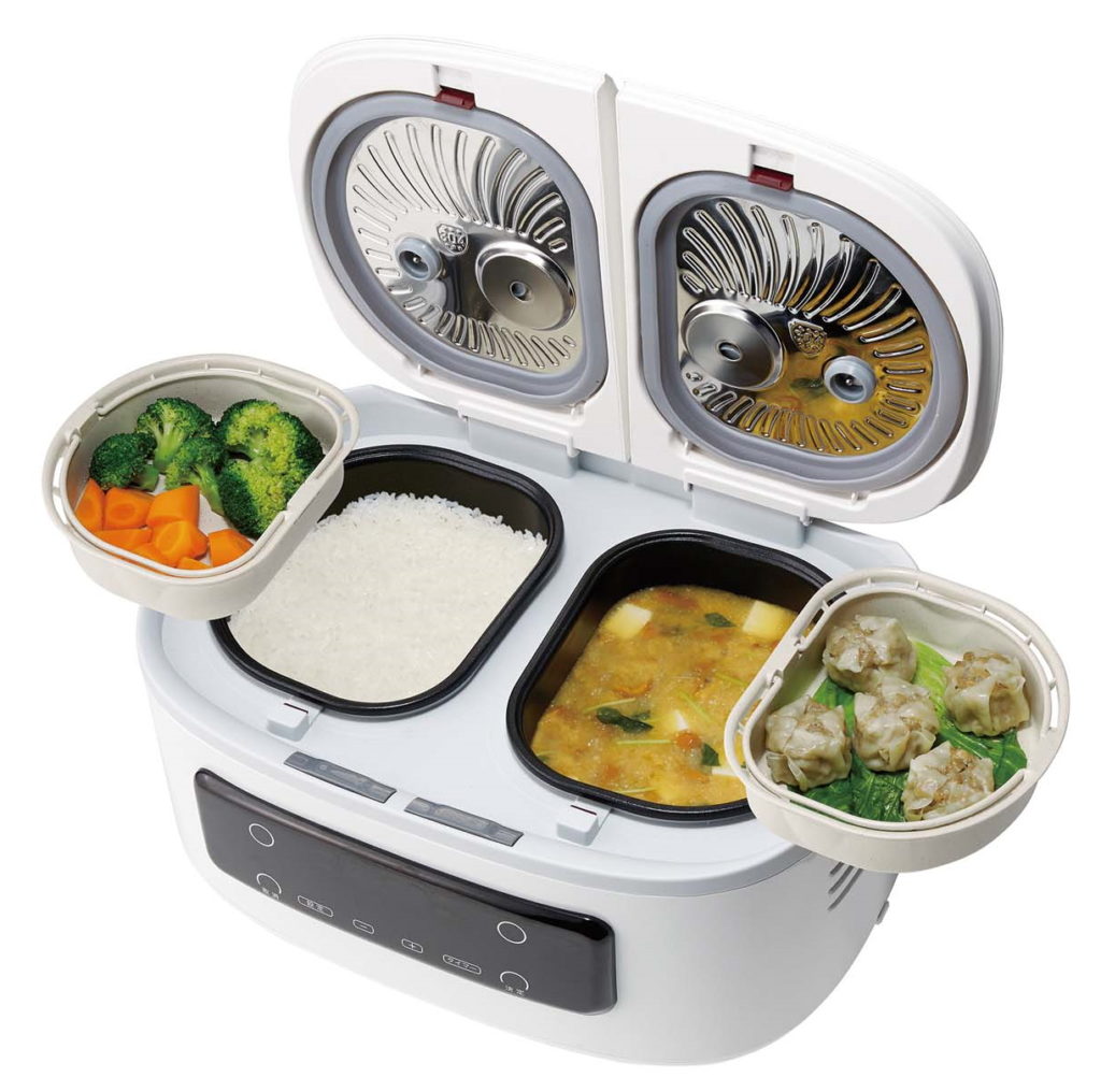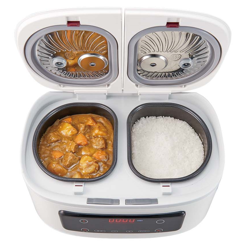 左右の鍋で炊飯と料理作りを同時に行える電気調理鍋。付属の蒸し器を使うことで最大4品の同時調理も可能です。10種類のクイックメニューを搭載するほか、手動調理にも対応。