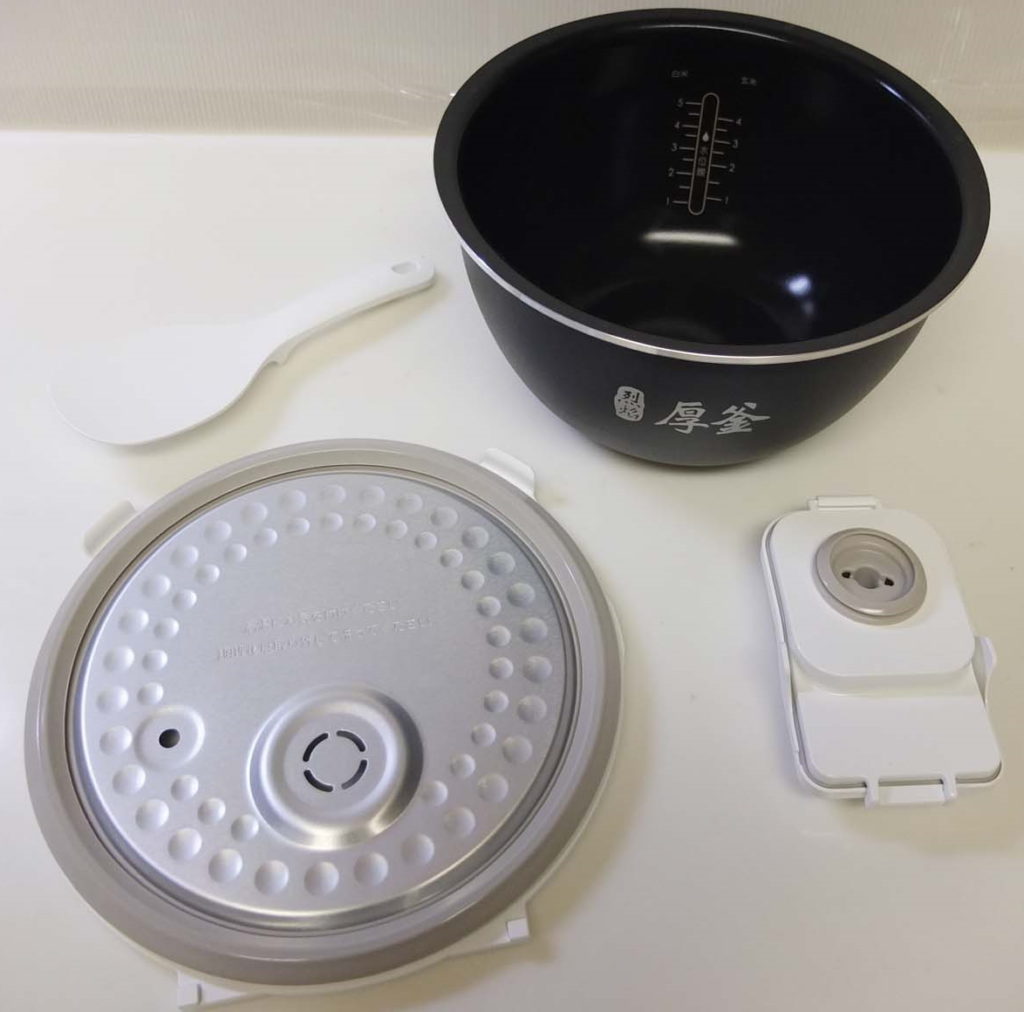 炊飯後に洗うパーツは内釜と内ぶた、蒸気口、しゃもじの4つ。内釜はノンスティック加工が施され、汚れがスルッと落ちます。内ぶたも構造がシンプルで凹凸が少なく、洗いやすかったです。