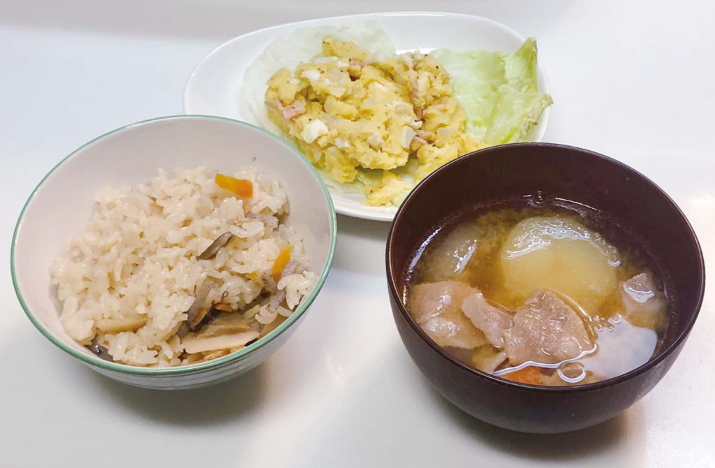 炊き込みごはんと豚汁とポテトサラダが完成