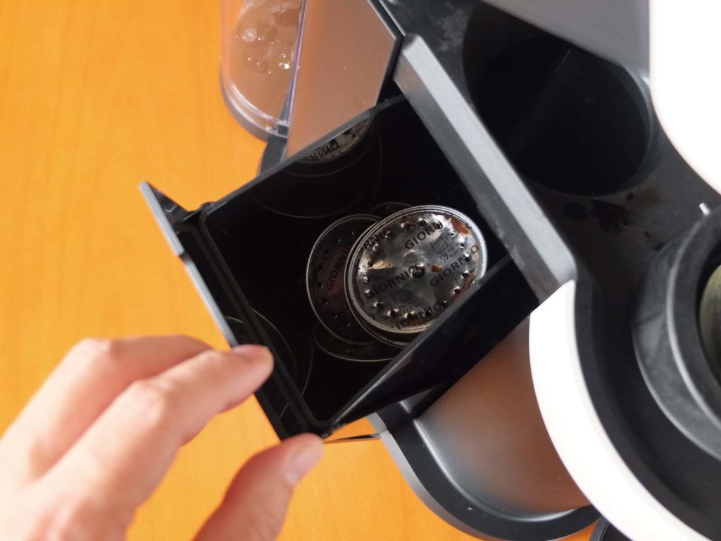 カプセル式で粉が飛び散らず、本体内のメンテはほぼ不要。使用済みカプセルは8個までホルダーに溜まり、まとめて捨てられます。