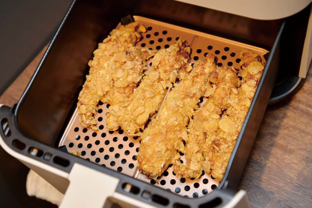 付属のレシピ集28品から、注目したのは「クリスピーフライドチキン」。なんと、油を使う揚げ方に比べて838kcalもカットできるとか。いざ食べてみると、衣サクサクの中しっとりで納得の味! また、廃油に手間がかからないのもステキ。これも利点です。