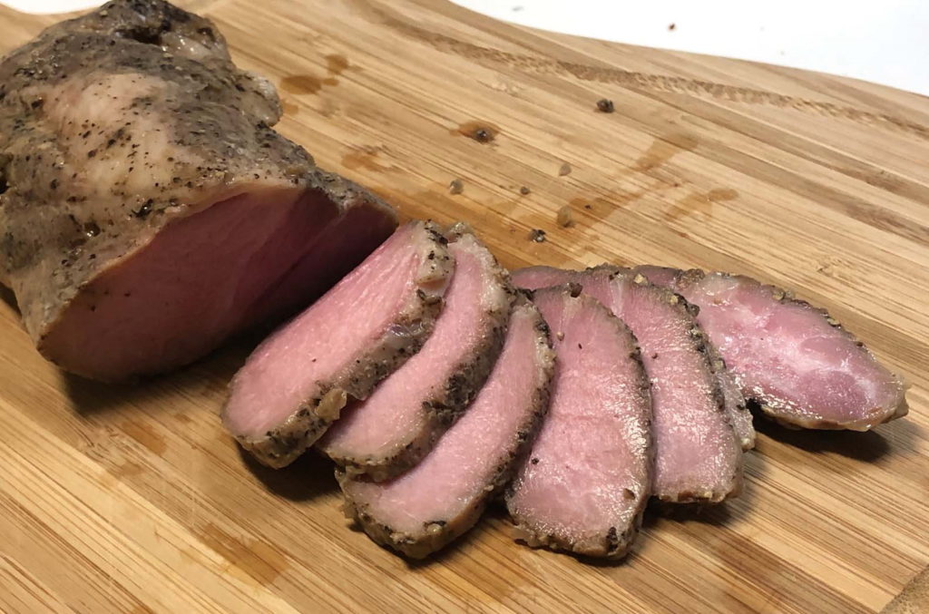 豚肩ロースブロック肉を58℃で約12時間かけて低温調理し、ローストポークにしてみました。ほんのりピンク色ながら中までしっかりと火が通っており、絶品の柔らかさに。