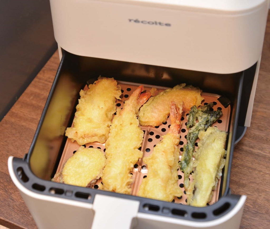 揚げ物の再加熱にも便利。天ぷらで試しましたが、衣はサクっと仕上がり、加熱によって余分な油は網の下に落ちるといううれしい結果に。