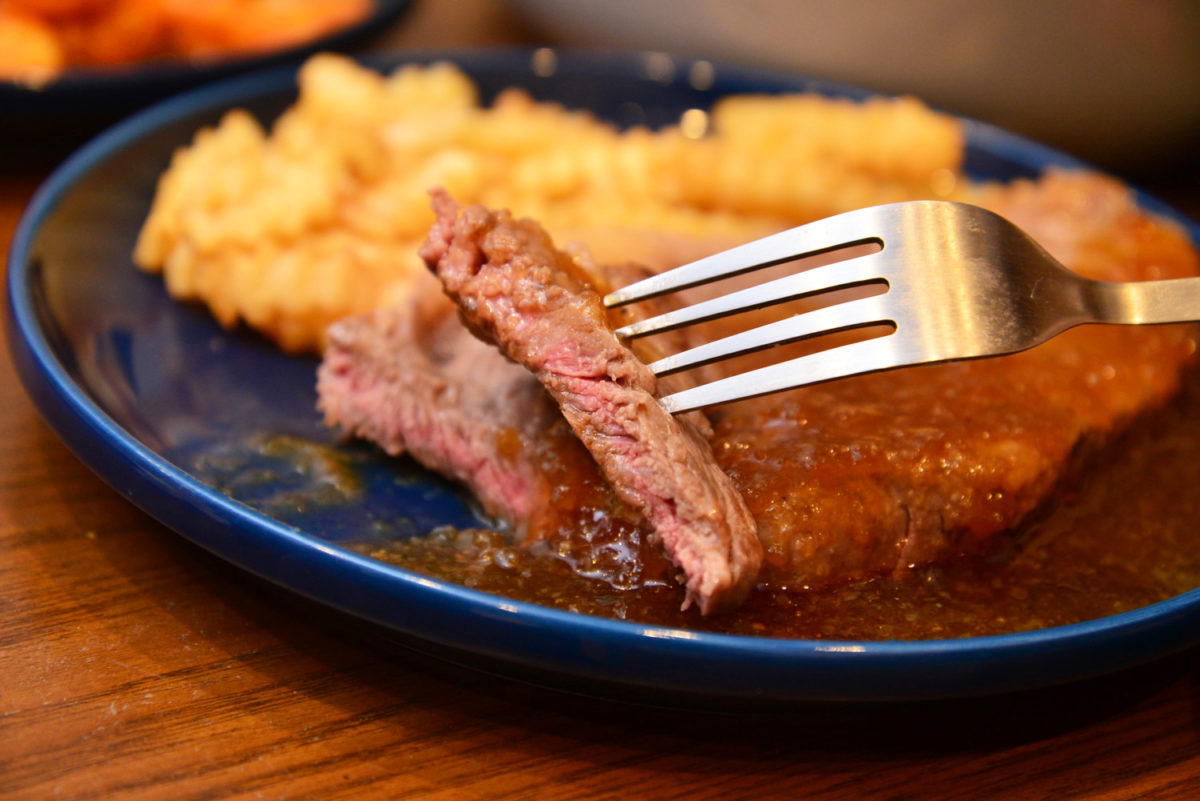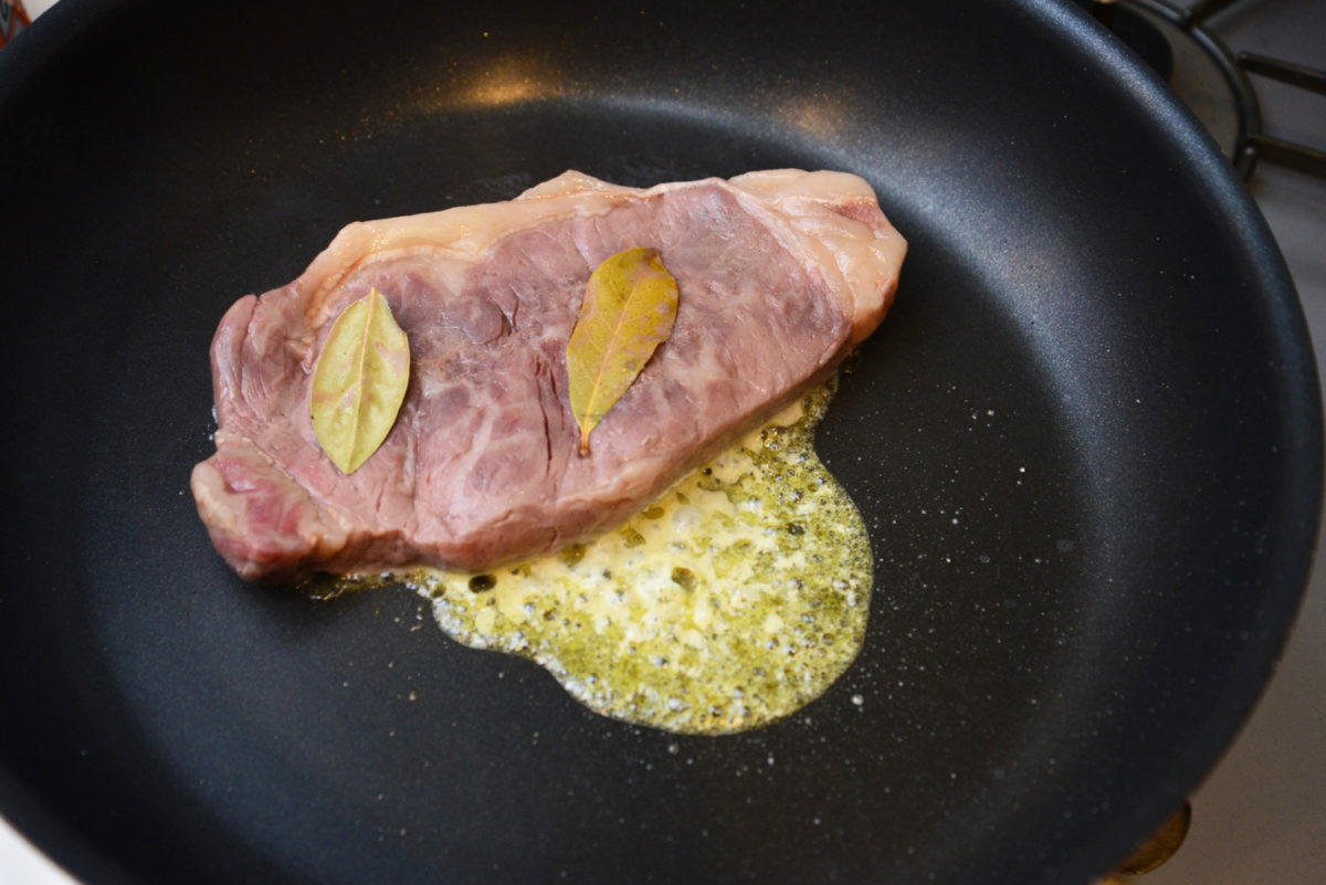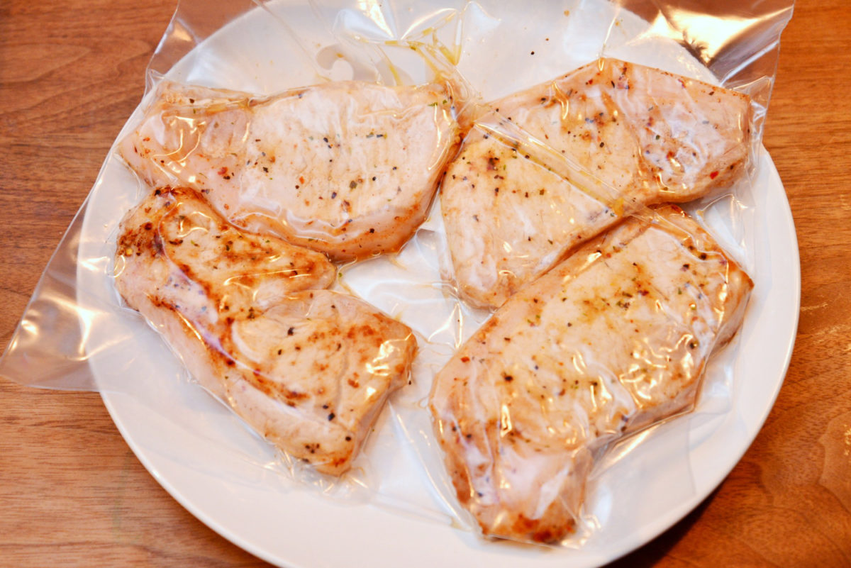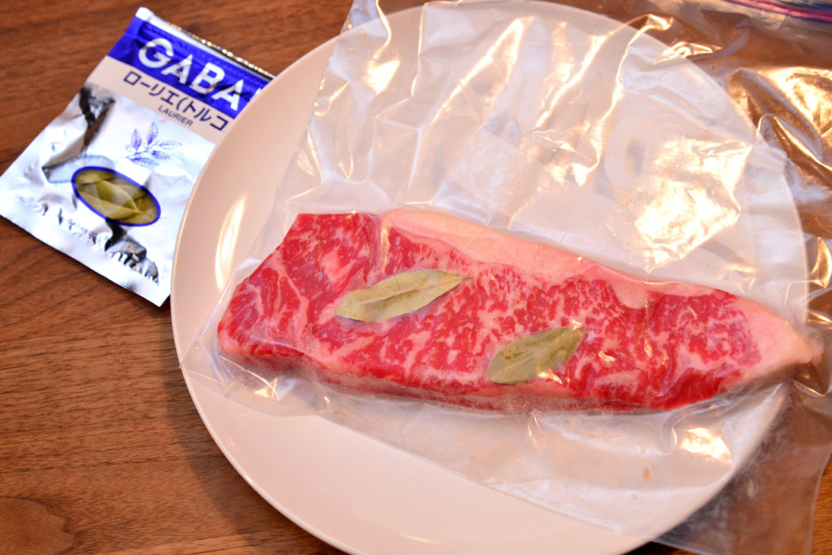 続いては低温調理でトンテキにチャレンジ。牛ステーキとは調理順が逆となり、まずはフライパンで表面に焼き色を付けます。あとで低温調理でじっくり中に火を通すため、加熱しすぎないのがポイント。焼き色がついたらすぐに取り出し、フリーザーバッグに入れて空気をしっかり抜きます。