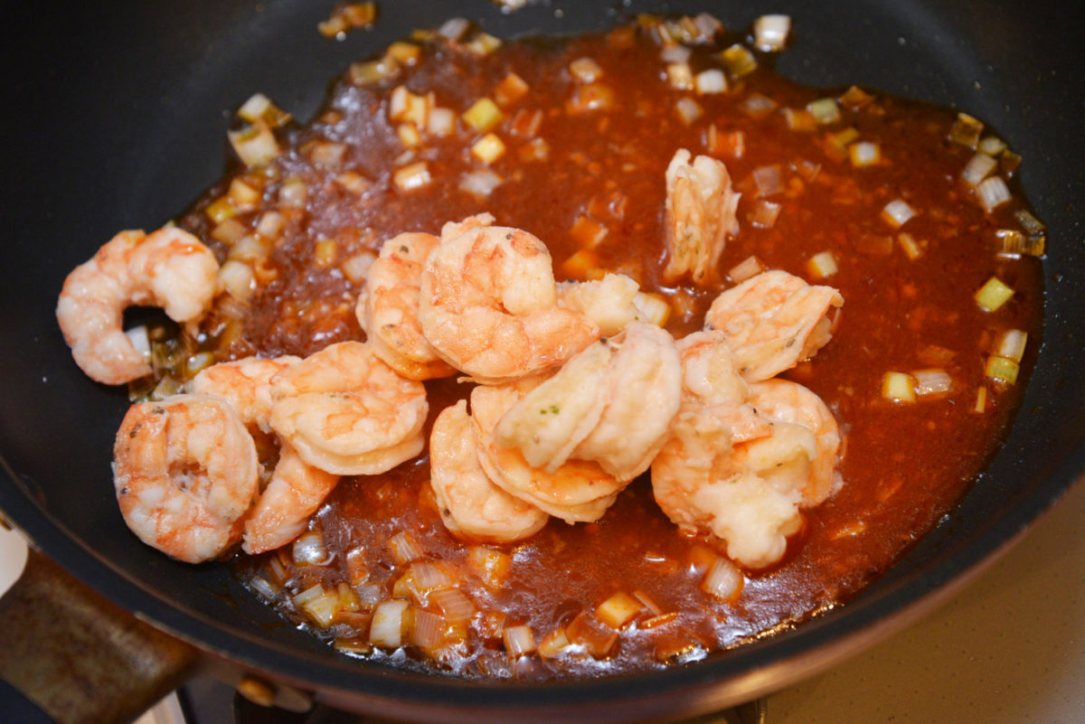 時間になったら海老を取り出し、フライパンで市販のエビチリの素と合わせます。温めたソースと絡めるだけで、短時間で簡単に仕上がります。