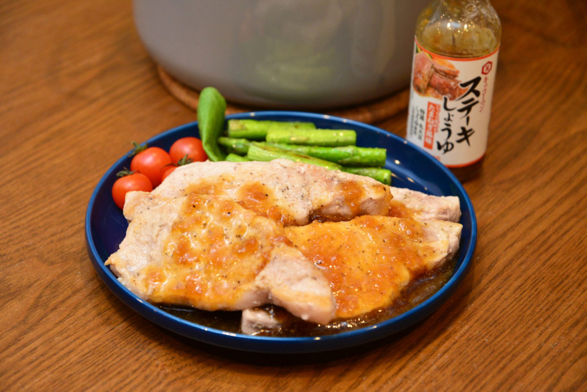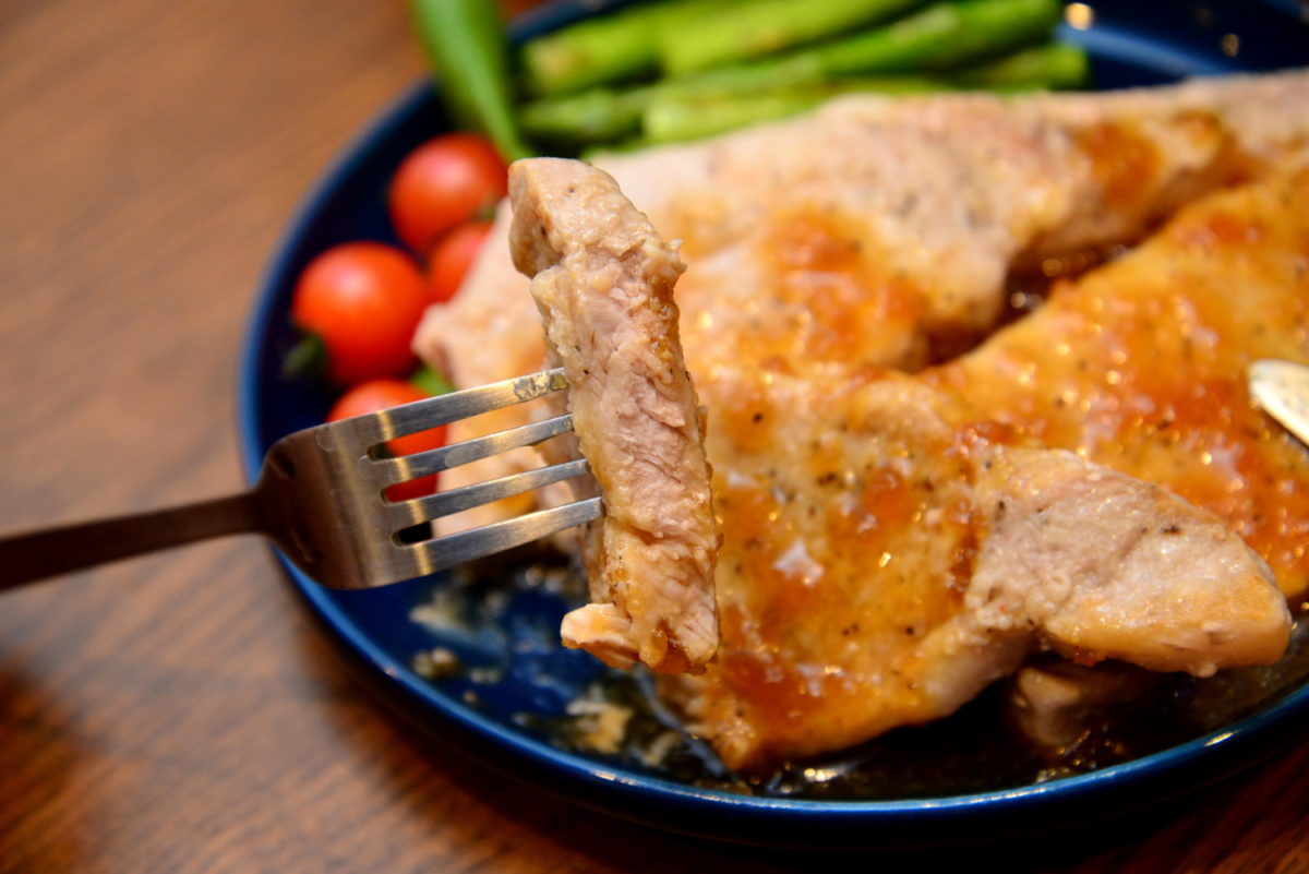 時間になったら、お肉を取り出して盛り付ければ完成です。パサついた印象はなく、しっとりしていてほどよい弾力もあり、こちらも美味! この心地よい弾力は、焼くだけでは出せない食感ですね。