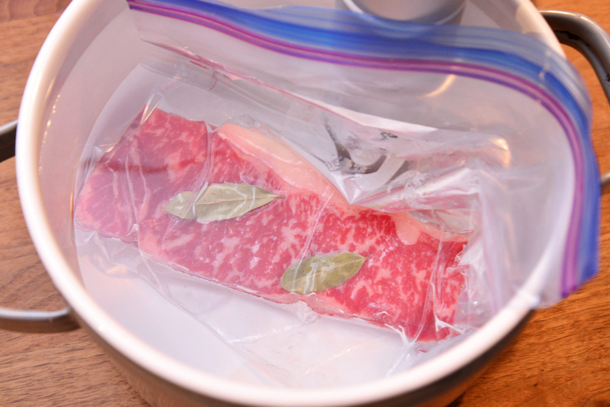 今回の設定は「63℃・1時間20分」(厚さ2cmの場合)。先ほどと同様に本体を水を張った鍋にセットして、設定温度になったら、フリーザーバッグを入れます。