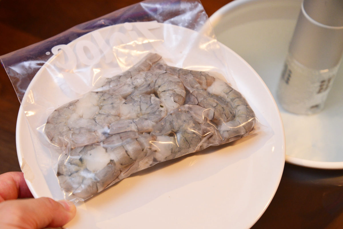 ラストは魚介系。ヘルシーな“揚げないエビチリ”を作ります。海老は殻をむいて背わたを除去し、片栗粉、塩、水で洗います。今回は、これをフリーザーバッグに入れて、「80℃・30分」で調理。肉料理よりも高温で短めの時間設定です。