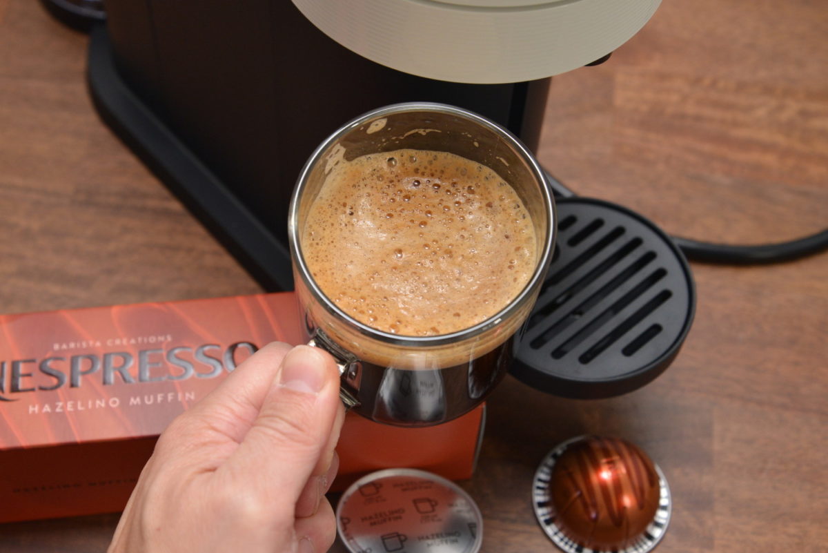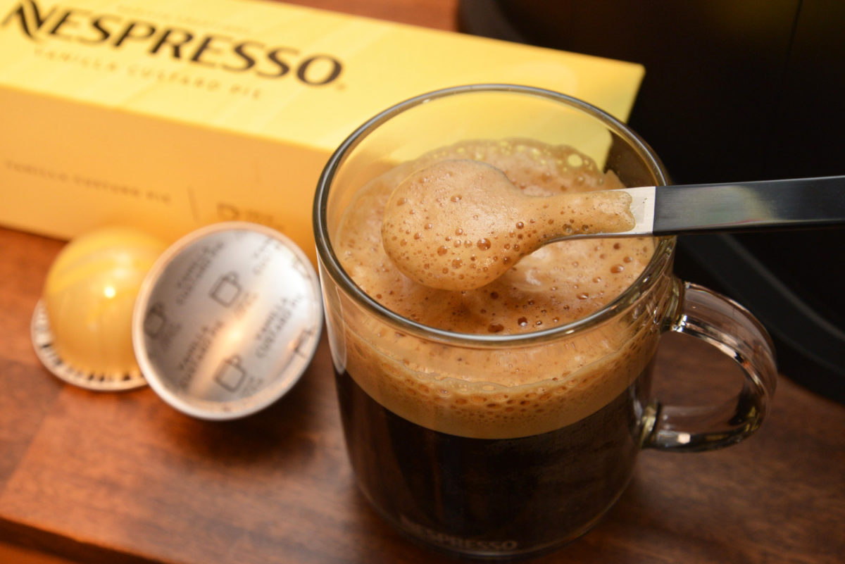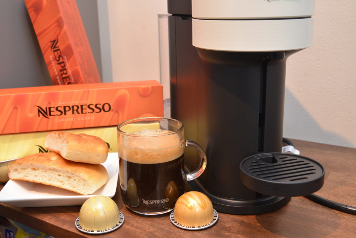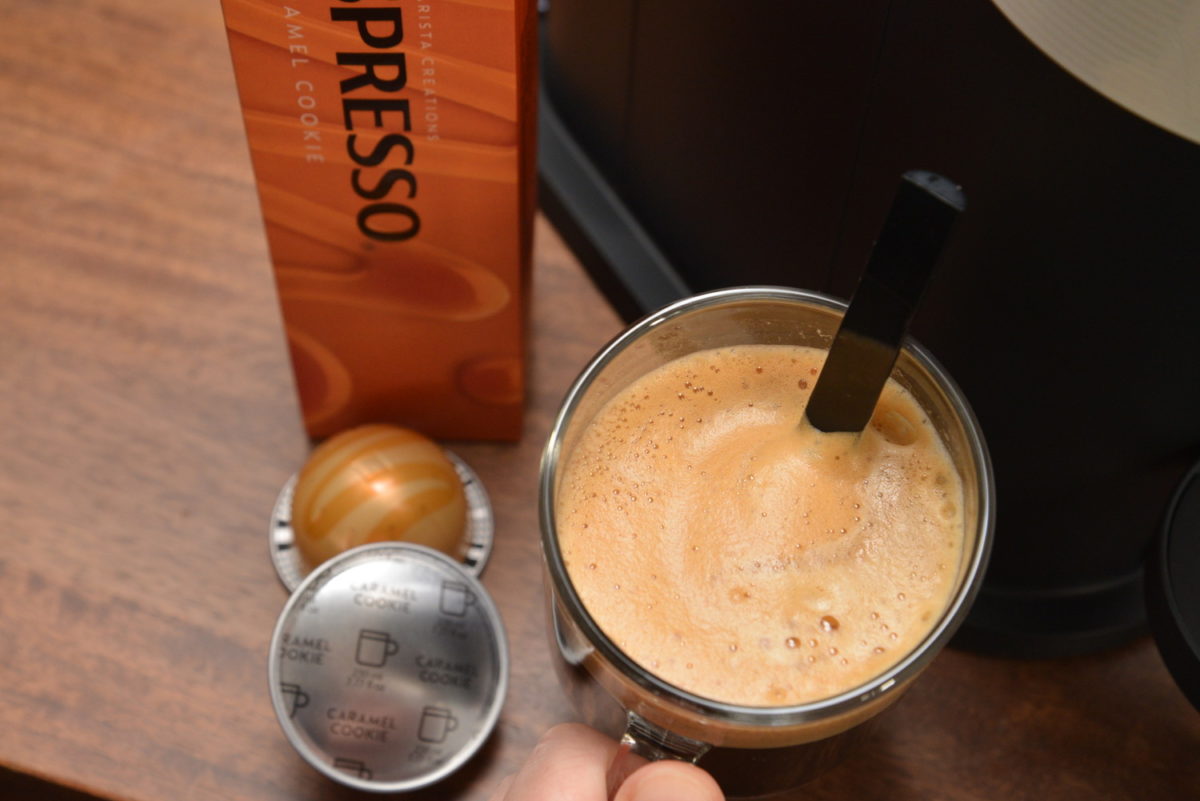 次は、4月1日発売の新作3種をトライ。これらは「バリスタ・クリエーションズ」というシリーズで、世界中の優秀なバリスタたちの熟練の技とクリエイティビティにインスピレーションを受けたもの。なかでも今回の3種類は、様々なデザートからインスピレーションを受けたといいます。カプセル名も「キャラメル・クッキー」「バニラ・カスタードパイ」「ヘーゼリーノ・マフィン」と、確かにデザートの名前になっていますね。これら3種はすべて約230mlのマグサイズで、1箱(10カプセル入り)1080円です。