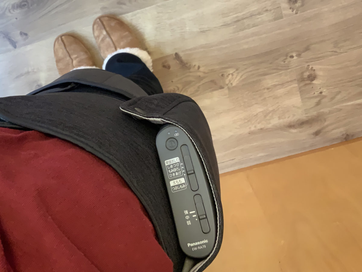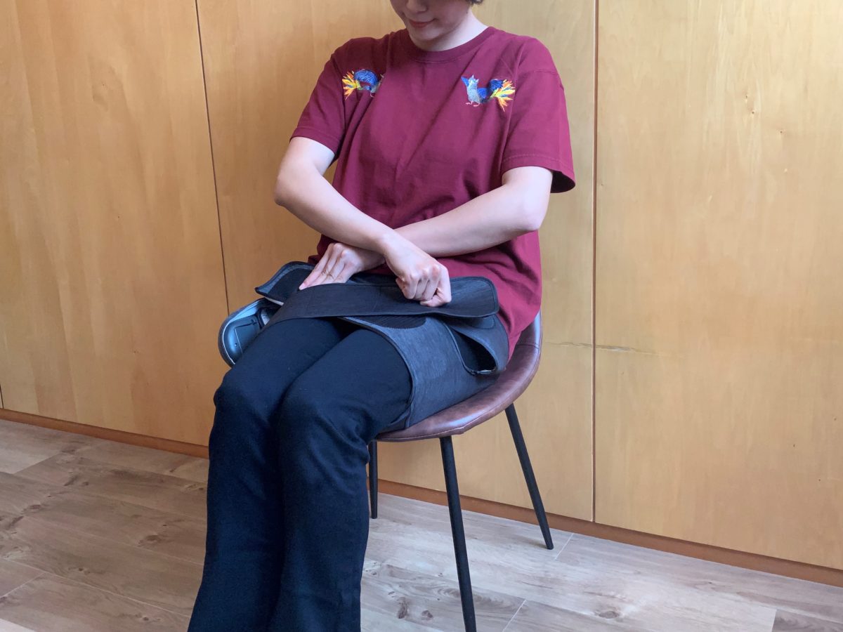 弱で設定しても圧が強め。まさに「つぶしもみ!」強にすると結構痛いです。ランニングで張りがちな太もも裏もしっかり揉んでくれます。脚を組まず背筋を伸ばして、ソファなどに座りながらするのがオススメだそう。コードレスなので、レースなどに持っていけば強い味方ですね。