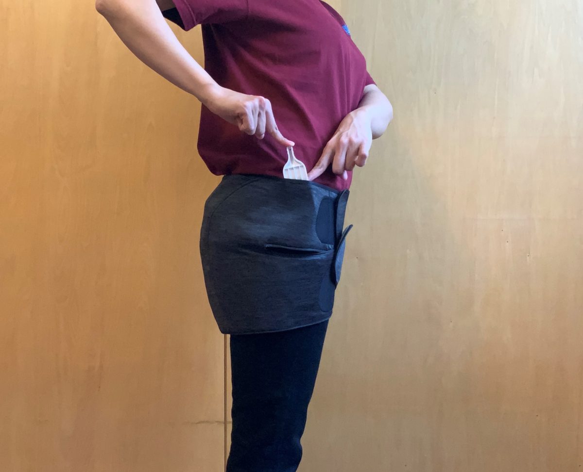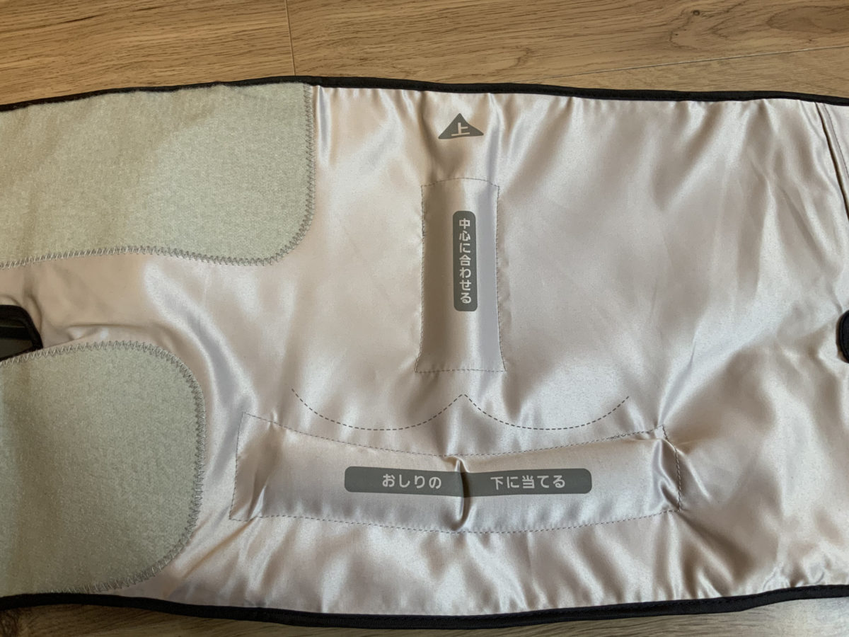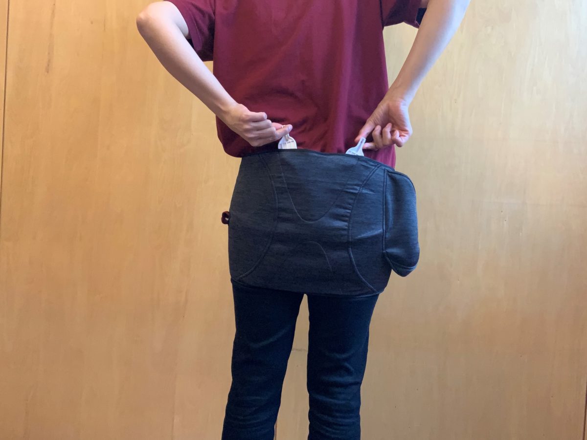 装着方法はとっても簡単。まずセンターガイドをおしりの割れ目に、ヒップストッパーをおしりの下に当てて正しい位置に巻き付けます。製品に印があるので初見でも迷いません。装着するときあまり前かがみにならずに背筋を伸ばすことと、足をしっかり閉じるとしっかり装着することができます。
