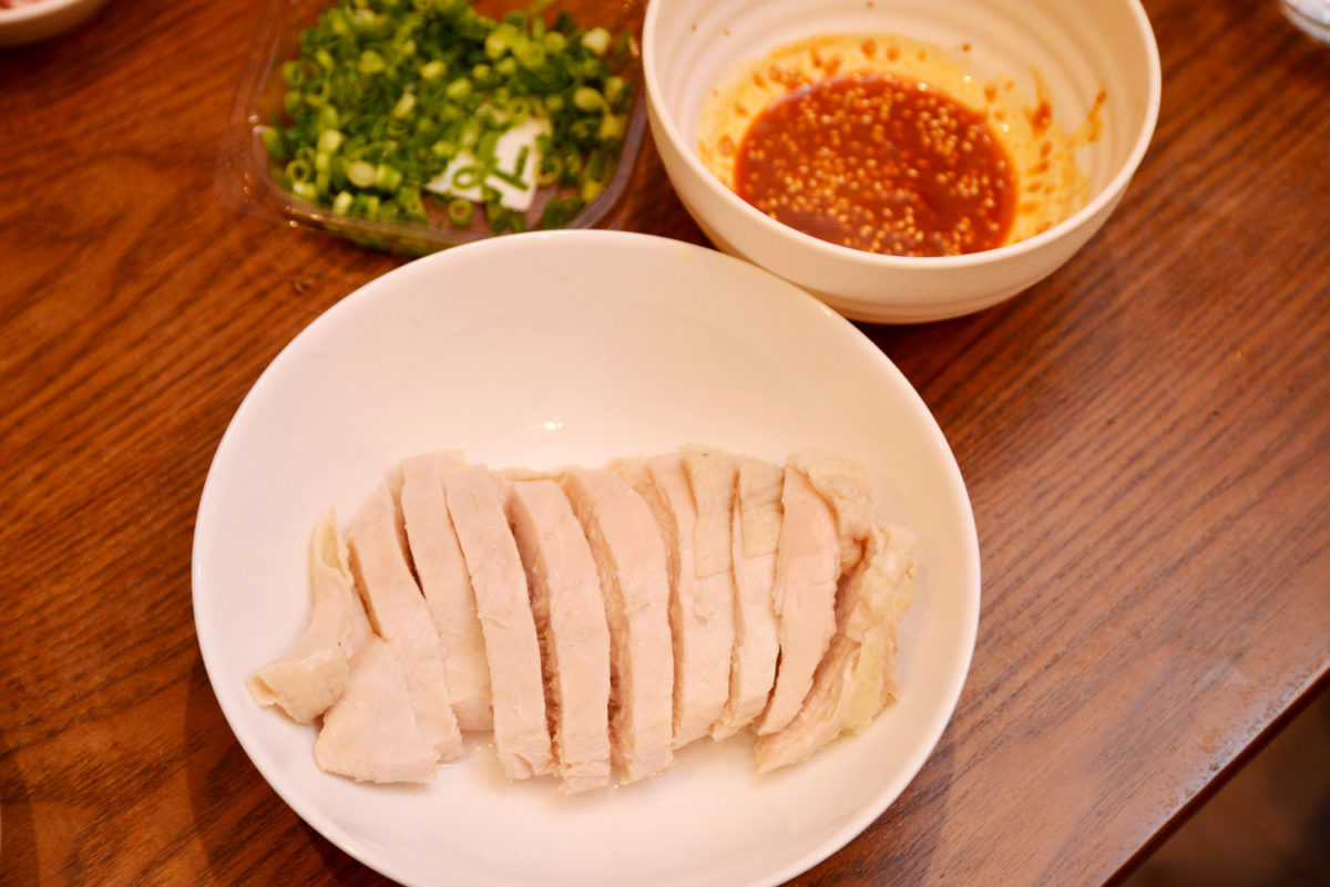 いろいろ堪能したので、最後は〆の一品として麺類をいただきます。サラダマグロの残った調味液に醤油を加えた煮汁を使って、魚介ベースの豚肉つけめんにトライ。中華麺は別の鍋でゆでつつ、サラダチキンメーカーではつけ汁を作ります。