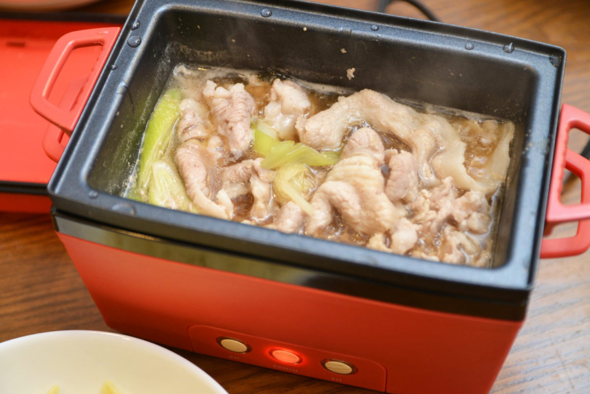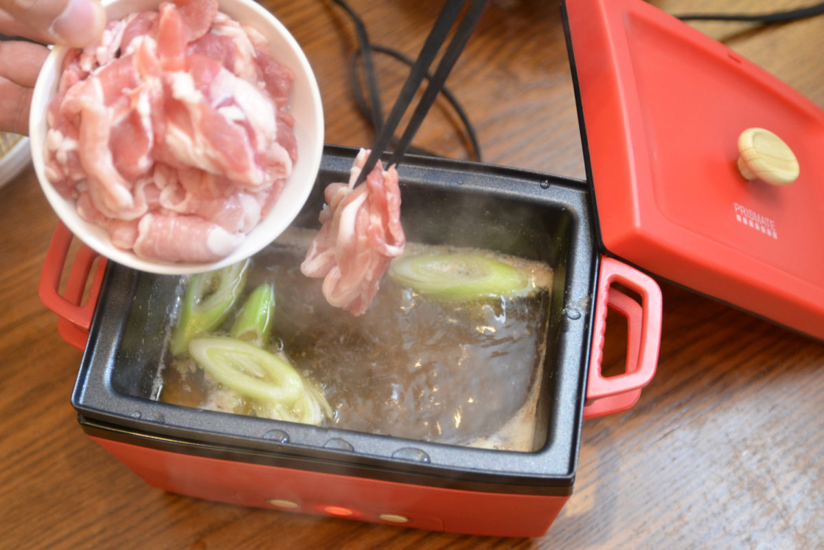 煮汁と水、砂糖、醤油、5mm厚の斜め切りにした長ネギ・すりおろししょうがを入れたら、スピードモードで加熱します。沸騰してきたら、豚のこま切れ肉を投入。豚肉が煮えたら、スープと麺をそれぞれ盛り付ければ完成です。