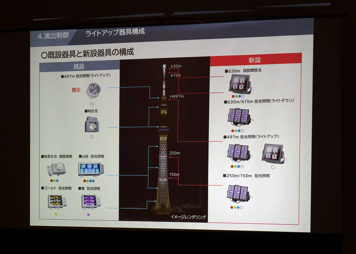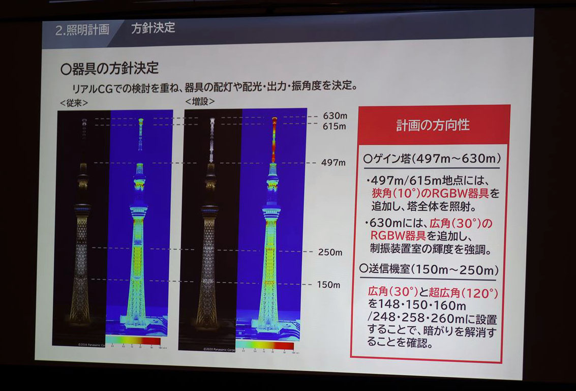 リアルCGでのシミュレーションの結果、ゲイン塔の497mと630m地点には狭角10度のRGBW器具を追加することでゲイン塔全体が発光しているように見せ、630mには広角30度のRGBW器具を追加することで輝度を強調。送信機室の存在によって暗がりが発生している150m付近と250m付近には広角30度と超広角120度の照明を設置して暗がりを解消する、という方向性が決定しました。