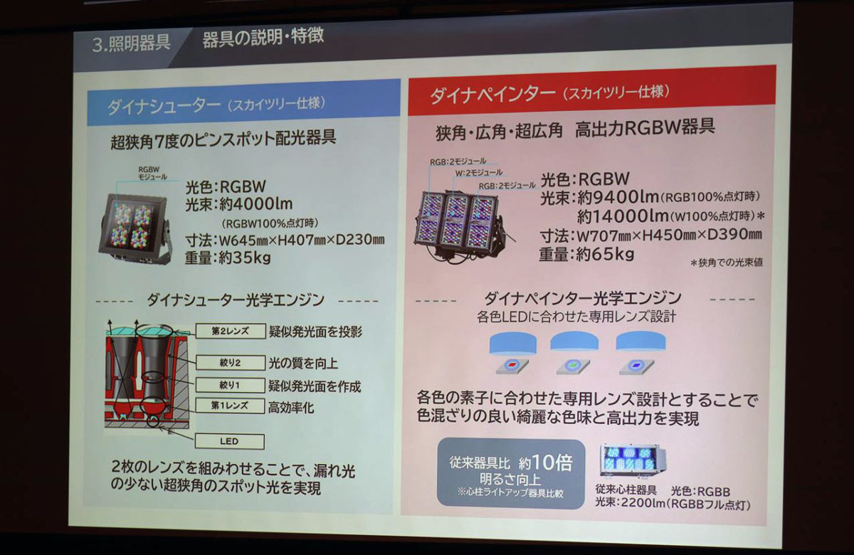 これらのシミュレーション結果を踏まえ、最終的に「ダイナシューター」と「ダイナペインター」という2種類の器具をスカイツリー専用にチューニング。ダイナシューターはRGBW光束約4000ルーメン超狭角7度のピンスポット配光器具で、塔頂部630mの18km先まで届く輝度光と497mのライトアップに使用。ダイナペインターは狭角・広角・超広角と幅広く調整できる高出力RGBW器具で、光束はRGB100%点灯時で約9400ルーメン、W100%点灯時で約1万4000ルーメンと、従来の器具の約10倍の明るさになりました。これらを630/615mからのライトダウンとして、497mからのライトアップとして使用するとともに、150/250m付近の真柱を照らす投光照明として使用することで暗がりをなくし、塔全体が発光できるようになったのです。