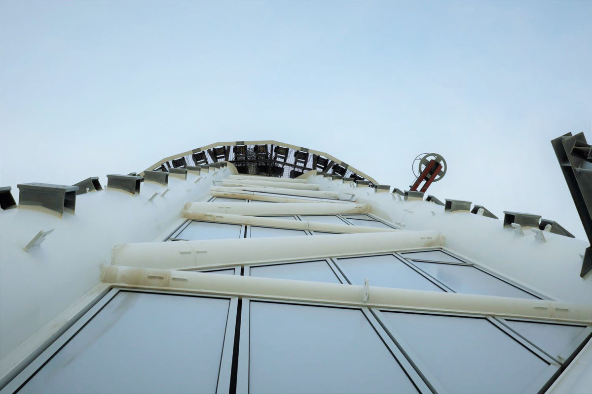 さすがに630mのゲイン塔頂部には素人は上れないのですが、実際に450mの天望回廊の上からゲイン塔の根本(497m)まで階段を上って照明器具の見学に行きました。天望回廊の上から見上げると、天望回廊上部をライトダウンする既設の照明器具が見えます。これから内階段を使ってここを上ります。497mのゲイン塔の付け根に到着すると、ダイナシューターとダイナペインターがゲイン塔をぐるりと囲むように並んでいました。眼下に見下ろす東京の街の風景と相まって、極めて壮観です!