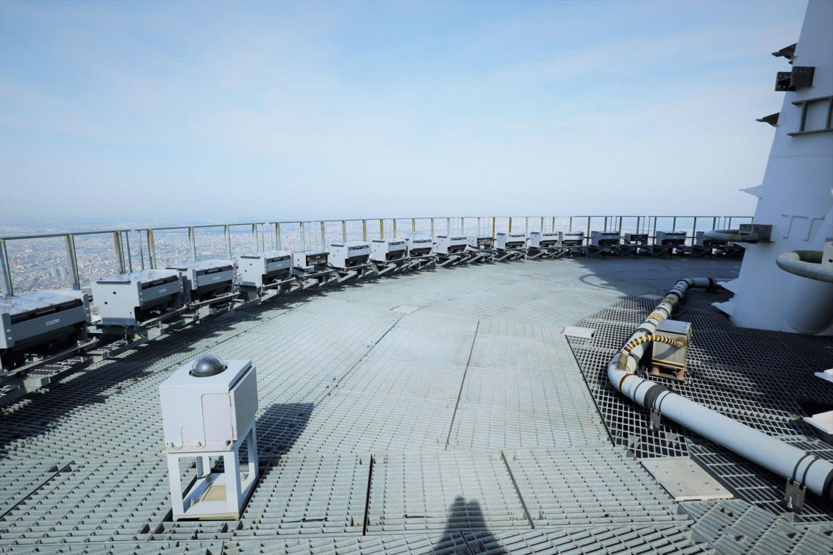 まずゲイン塔は、630mの塔頂部に18km先からも見える72台の輝度光を増設するとともに、塔頂部をライトダウンする照明24台を増設しました。18km先の羽田空港や東京都庁に光軸を向けるため、塔頂部の輝度光はマイナス2度ほど下を向いています。18km先からの視認性を検証するのに、エレベーターのないスカイツリーの頂部に機器を設置して何度も上り下りできるものではないため、スカイツリー横のイーストタワー屋上に照明器具を設置し、19km離れた埼玉県越谷市の越谷レイクタウン屋上から視認する方法をとったとのこと。