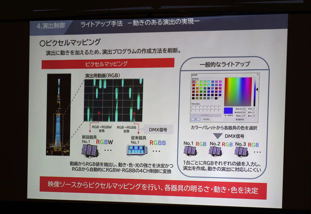 なお、シミュレーションに基づいた正確な器具の配置により、スカイツリー全体が明るく鮮やかになったのですが、先に説明した新しい照明プログラムにも新技術が投入されています。一般的なライトアップの場合、カラーチャートから各器具の色を選択し、それを器具1台ごとにRGBそれぞれの値を入力するという手法が取られています。これだとプログラム制作に膨大な手間と時間がかかり、複雑な動きには対応できません。そこで今回は「ピクセルマッピング」という手法が導入されました。まず演出用の映像ソースを作成し、そのデータから色、明るさ、動きを決定、自動的に制御信号に変換してプログラムを作成するという方法です。
