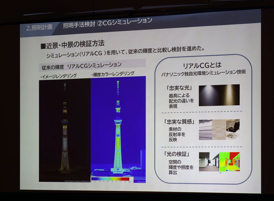 こうした光の演出を実現するための照明器具の種類、数、配置、角度、輝度、色なども、実際に器具を設置して検証することはできません。そこで今回、リニューアル照明器具の製作を担当したパナソニック・ライフソリューションズ社が持つ独自の光環境シミュレーション技術「リアルCG」を利用することとしました。リアルCGは器具の種類による色・広がりなど配光の違いだけでなく、周囲の建造物の素材による反射率や、空間の広さによる輝度・照度の違いなども忠実に再現できるもので、街づくりの際の街灯の配置シミュレートにも活用されています。