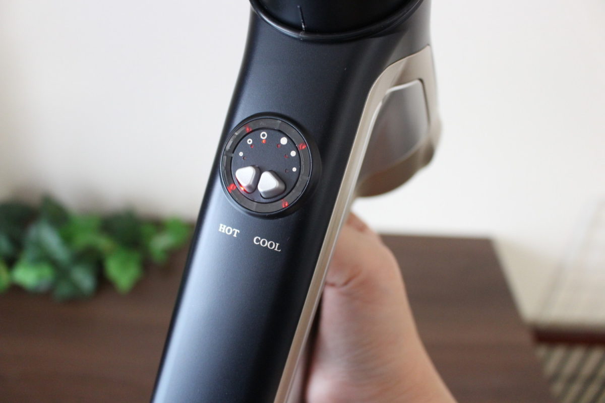 ではさっそく使ってみましょう。髪を洗ったあとタオルドライした状態で、いつものように乾かしてみます。なお髪や頭皮からの距離は、5cm推奨とかなり近いですが、温風温度は70℃を超えない低温だというので、髪や頭皮へのダメージは少なそう。なおマイナスイオンなどイオンを放出する機能は搭載されていないようです。