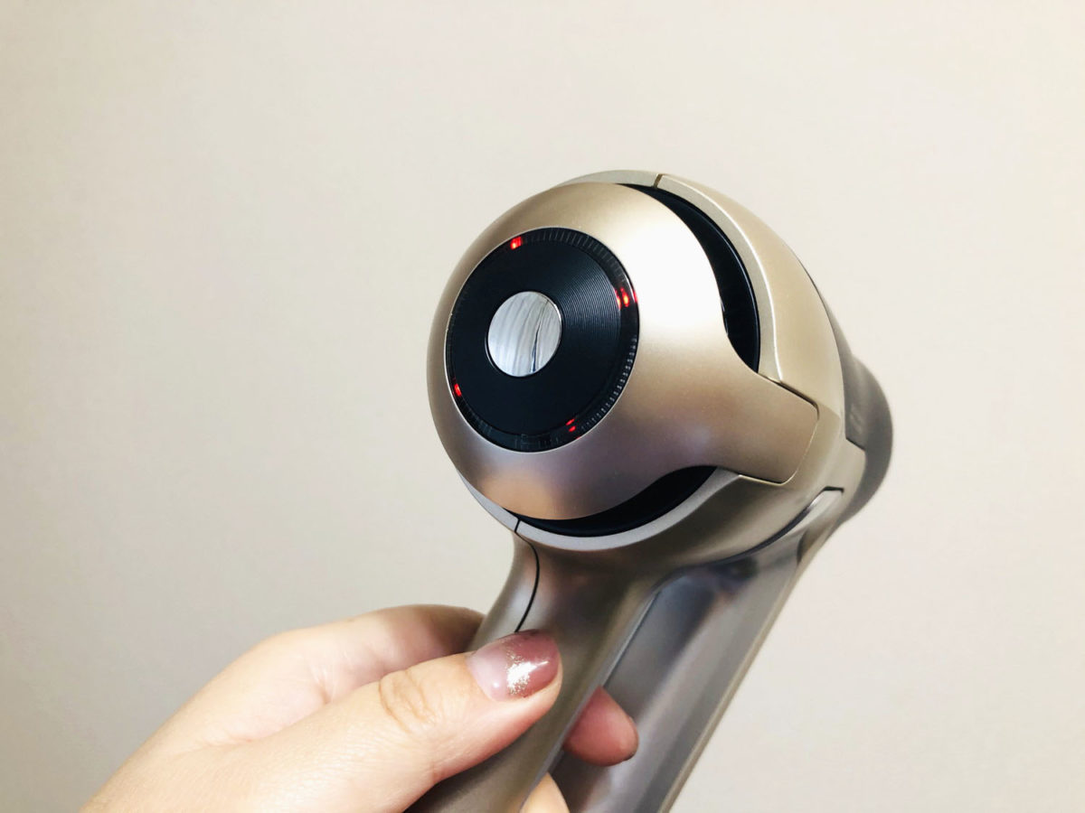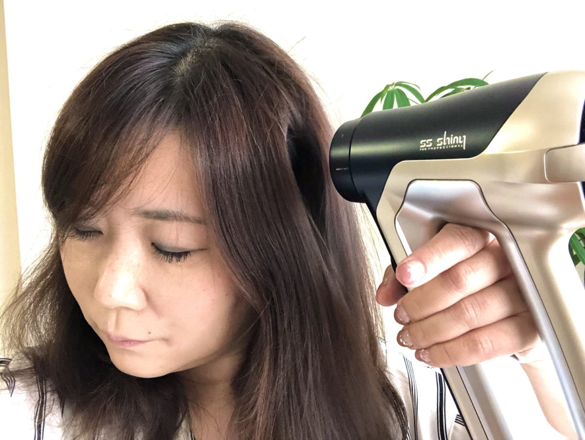 いよいよ温風ボタンを3回押し、強モードにして髪に当ててみたところ、なるほど確かにしっかりと風は感じます。髪から5cmとかなり近づけられるため、髪をかきわけ地肌も見えている状態に。しかし、強温風の割には勢いが感じられない……。そこで吹き出し口を改めて確認したところ、吹き出し口が小さい! 髪に当たる範囲も小さいせいか、風量がなかなか実感できませんでした。