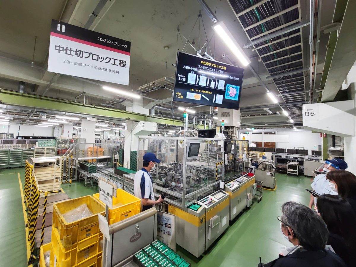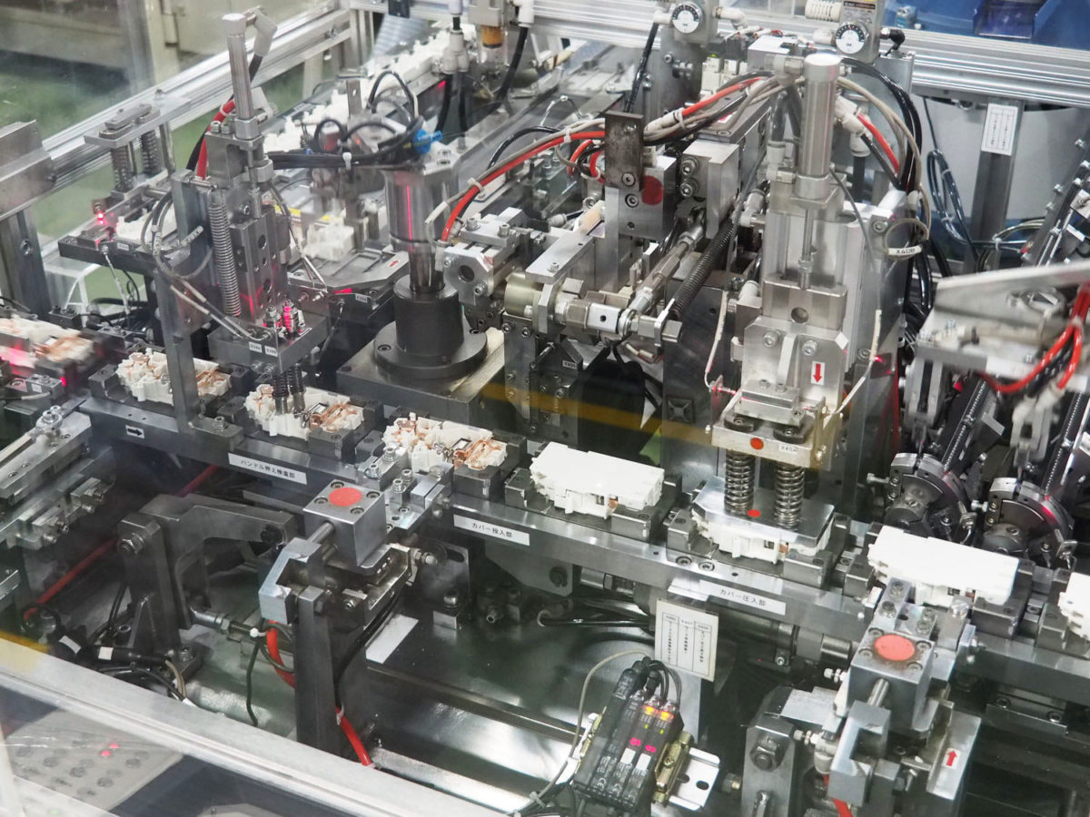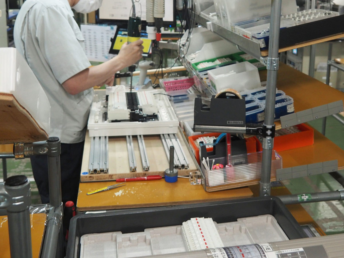 短時間で3万6000種類の分電盤を作り分ける秘密は、一貫自動化生産と人の手による組み立てを使い分けているところにあります。分電盤は住宅によってカスタマイズする必要がありますが、分電盤に配置されるブレーカーなどは仕様がほぼ統一されています。そこで、大量に生産できるパーツは機械による完全自動生産が行われているのです。機械による完全自動化によって、主力であるコンパクトブレーカーの生産スピードは一個につきわずか1.1秒!