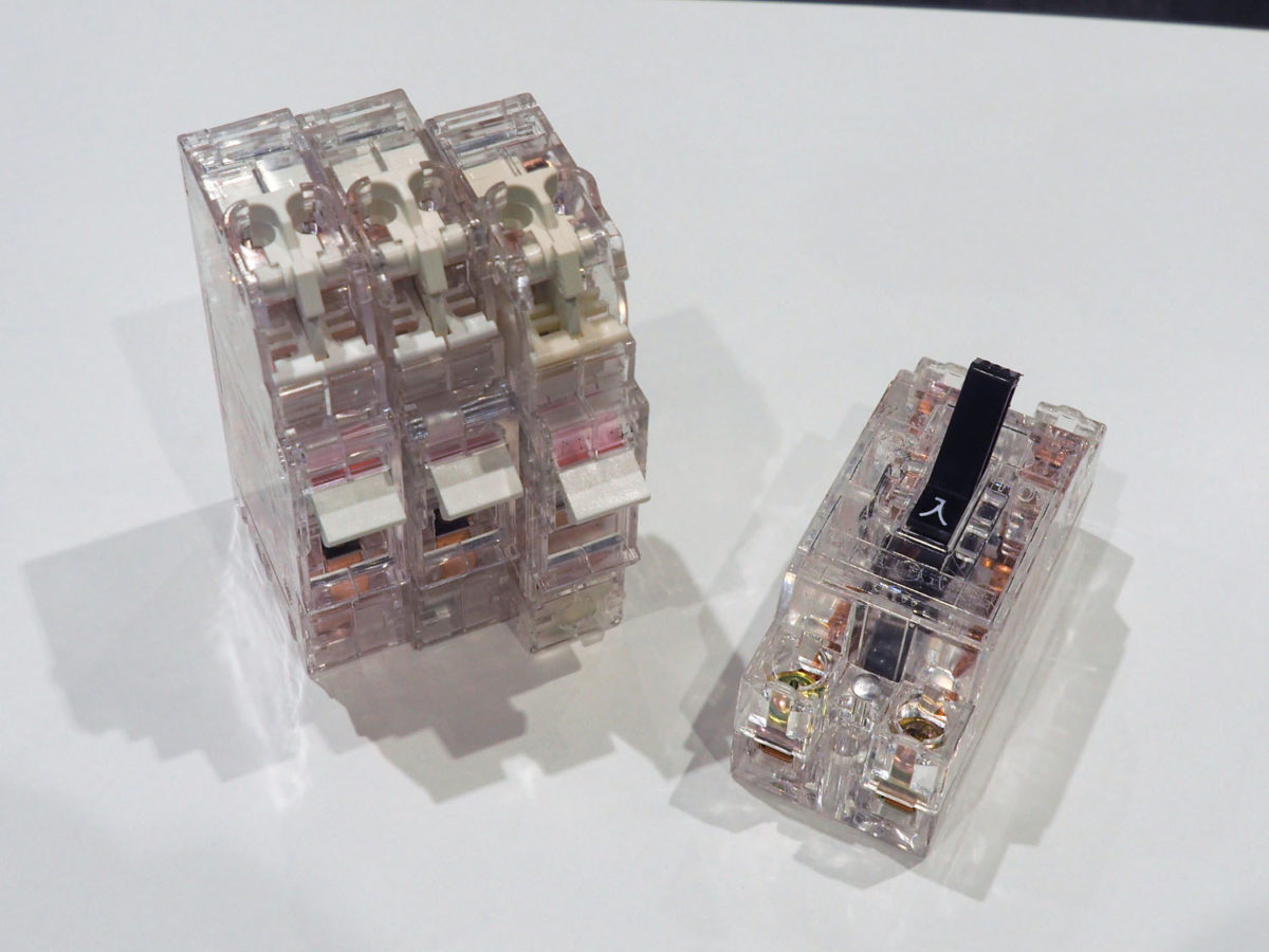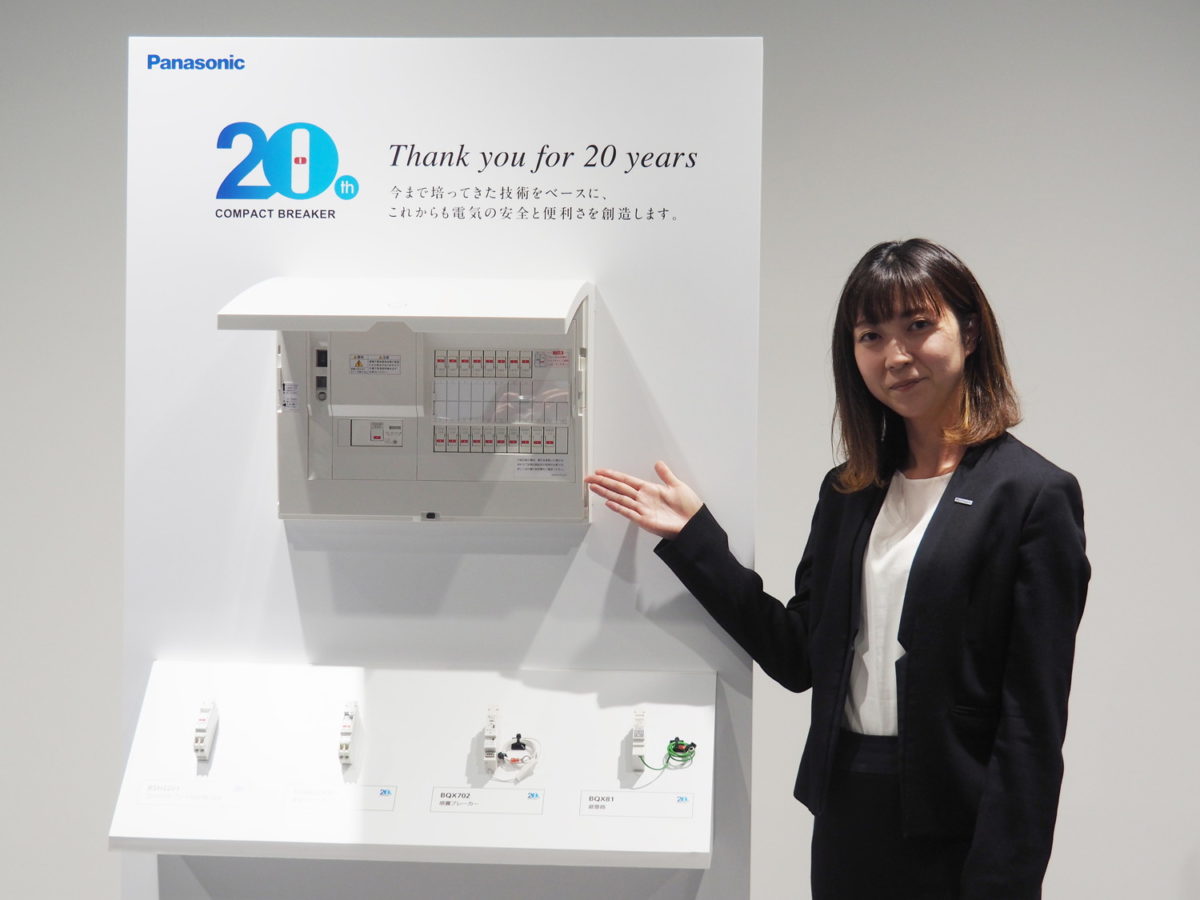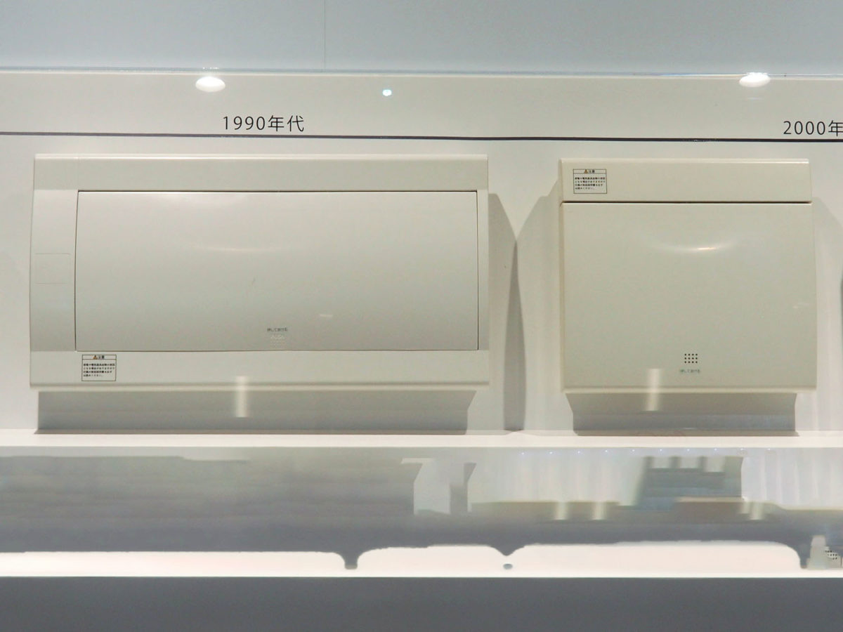 通常はなにかあったときしか目にしない分電盤ですが、実は時代とともに大きく進化しています。なかでも、一番わかりやすいのは「大きさ」。分電盤はそもそも目立たない場所の壁に設置されることが多いため、1990年代まではあまり大きさを問題にすることがなかったのですが、住宅の電化が進むとともに搭載されるブレーカーの数がどんどん増え、分電盤も巨大になりました。そこでパナソニックはブレーカー一個一個のサイズを従来の半分ほどに抑えた「コンパクトブレーカSH型」を開発しました。