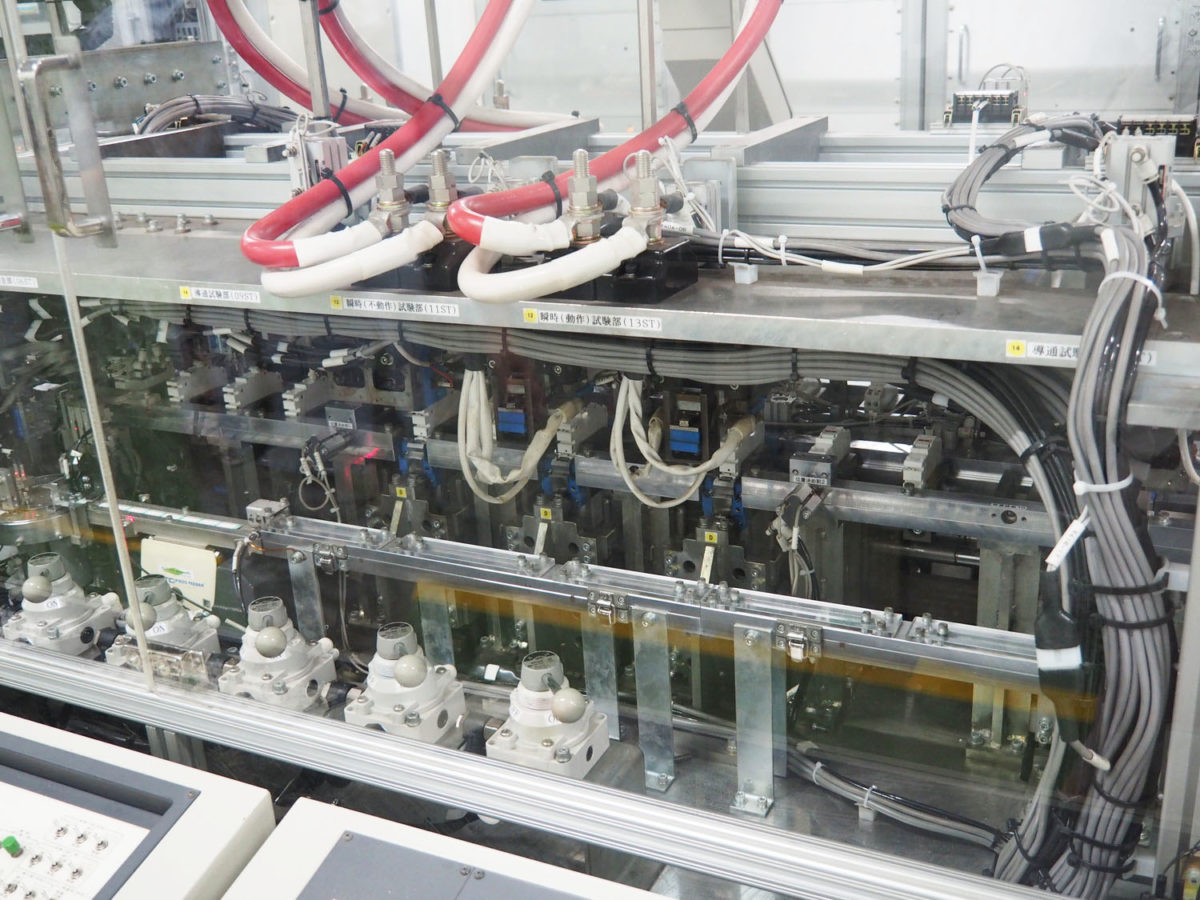 ブレーカー完成品はすべて「過電流に即時反応できるか」「規定範囲の絶縁耐力があるか」といったテストを受けます。この試験機もすべて自動化。人の手によるうっかりミスがないため、なんと歩留まり(素材の投入量に対し、実際に得られた生産数量の割合)は99.7%! つまり1000個の製品を作って不良品は3個しなか出ない計算です。