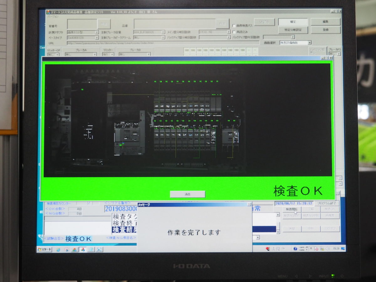 分電盤は家庭の安全を守る製品でもあるため、完成後のチェックにも抜かりはありません。組み立てた分電盤はひとつひとつカメラで撮影し、注文した通りの内容で組み立てられているかを機械が自動的に判断してくれます。さらに、ここで撮影したデータは一定期間保存されるので、万が一分電盤を設置したあとに問題が起きた場合はすぐに「組み立てた製品」の写真データを工場側がチェックできるようになっています。