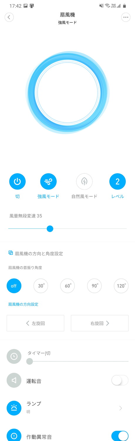 ↑2Sのアプリ画面はこちら。風量を100段階から変更できるほか、自然風の切り替え、チャイルドロック、首振りのい有無に首振り範囲など、本体では操作できない細かな点まで設定できます