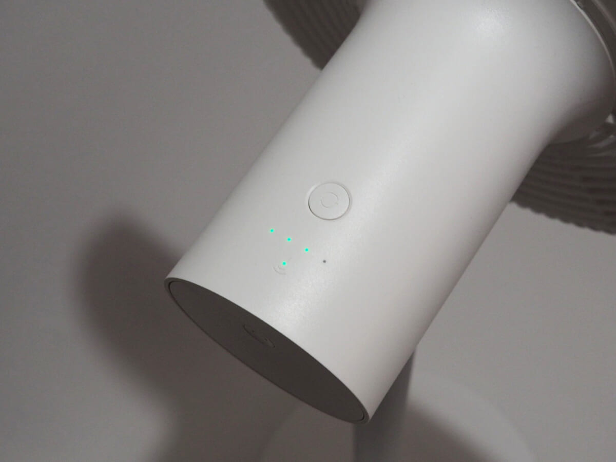↑物理操作ボタンは羽根裏上面に配置。余計な説明はなく、長押しで電源ON/OFF、普通に押すと風量を4段階で切り替えてくれます