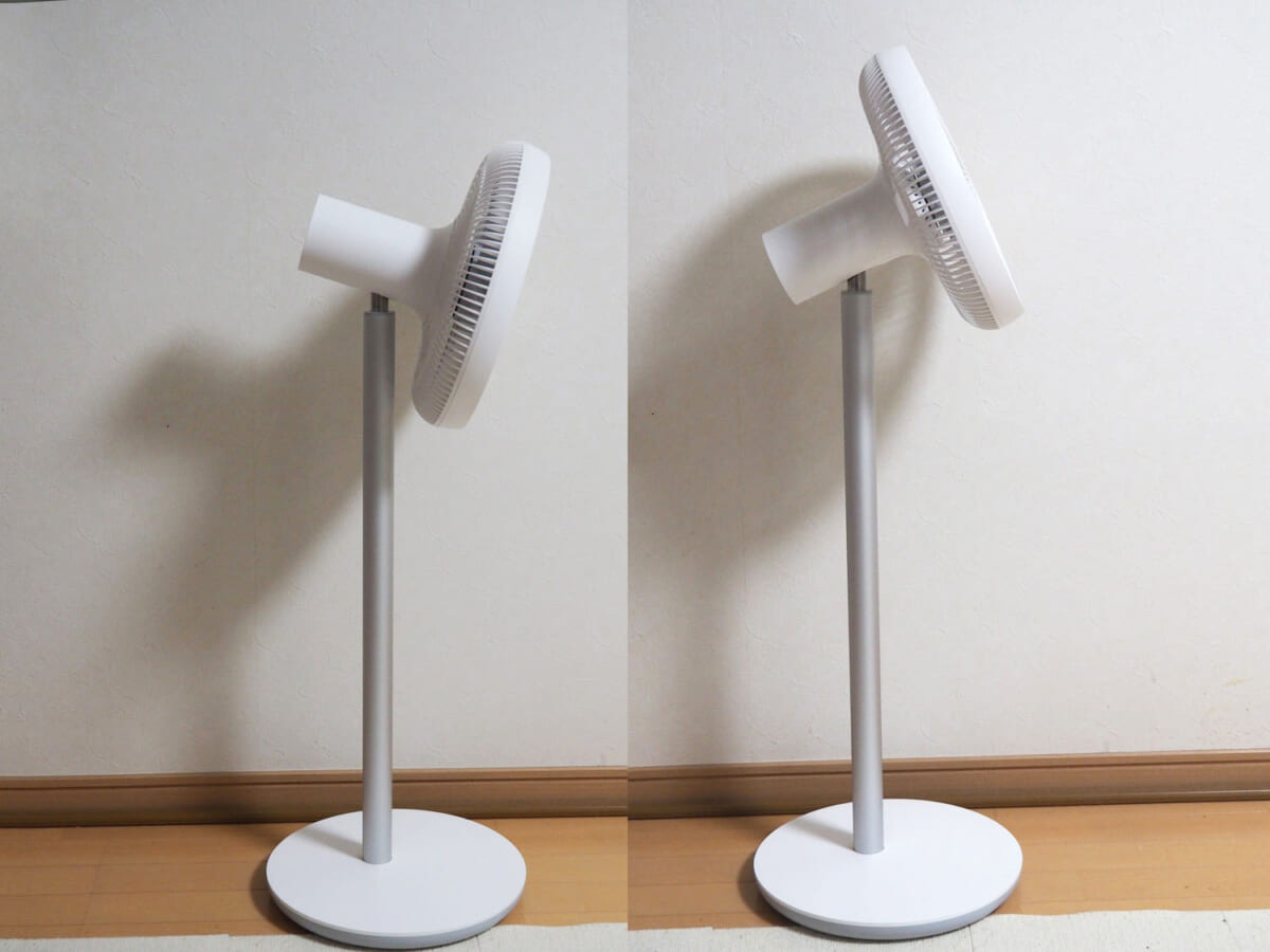↑首は写真の幅で上下に角度をつけることができます。扇風機としては十分な角度ですが、個人的にはもう少し上に向いてくれると部屋干しの補助やサーキュレーターとして使いやすいと感じます。横方向には左右120°まで首振り可能です