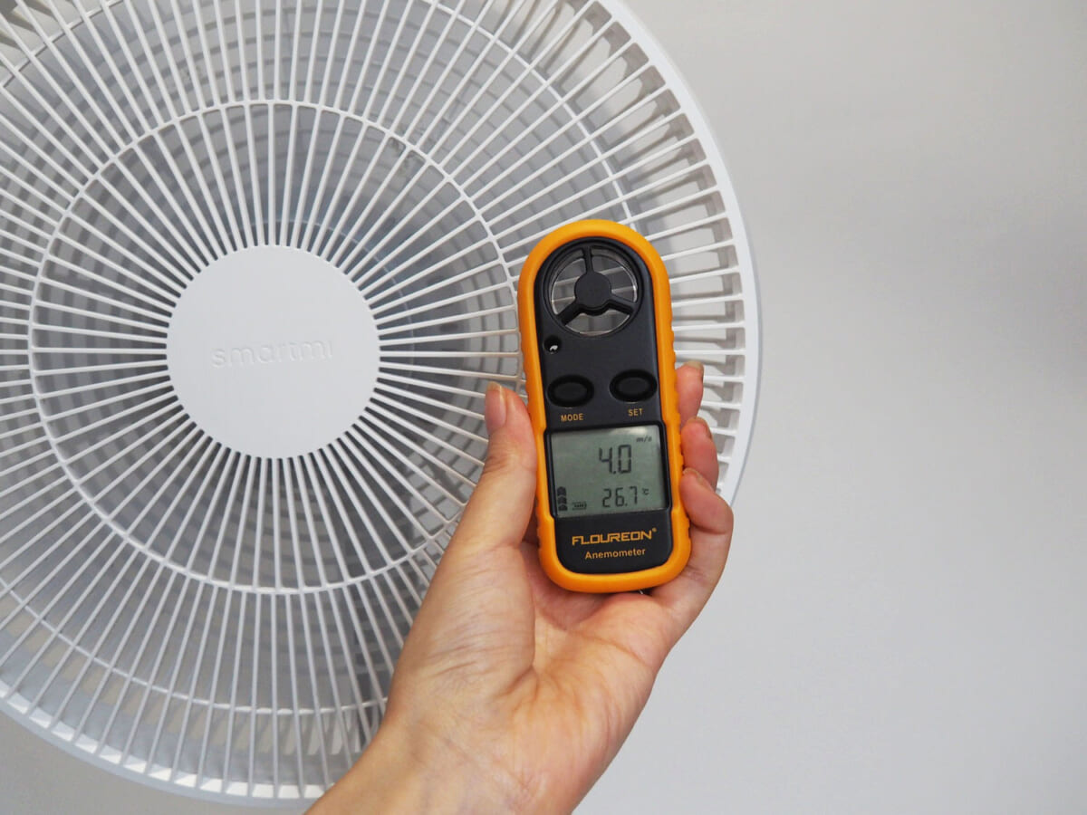 ちなみに、2Sは手動で4レベルのパワーを切り替えられますが、スマートフォンと連動させればアプリからなんと100段階の風量切り替えが可能です。実際に風を感じてみると最大パワーの風量100では廊下の端から端までの3.5mほど離れても風をしっかりと感じるレベルのパワーがありました。風速計で計測したところ、最大パワー時の平均風速は約4m/s前後で扇風機としては平均程度かやや強い程度でしたが、直進性能が高いために風が遠くまで届くようです。