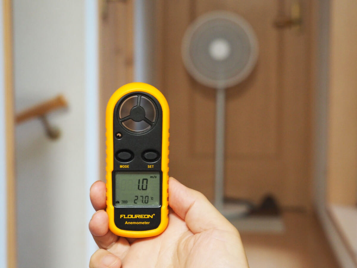 ↑廊下の端に2Sを置いて3.5m地点で最大風量の風を計測。1m/sというなかなかの数値になりました