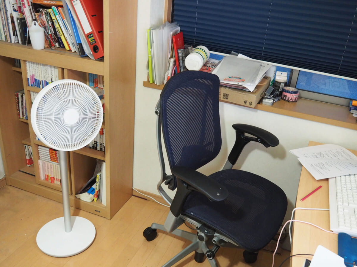 ↑机のまわりは紙の資料だらけ……という我が家では、紙をまき上げずに静かな微風が非常に便利でした。在宅勤務で同じような状況の人も多いのでは? 微風でも直接風を当てれば意外なほど涼しく、クーラーの設定温度はいつもより2℃ほどあげていました