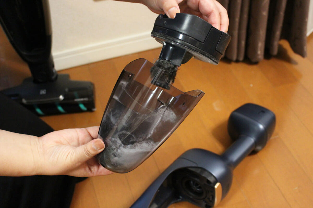 続いて、ダストケースにゴミが溜まったので、ゴミ捨てをチェック。エレクトロラックスのゴミ捨てというと、小さいプリーツフィルターの中に溜まったものをトントンと出さなければならず、ちょっと面倒なイメージがありましたが(笑)、今回はプリーツフィルターが入っていない様子。片手でワンタッチとはいかないものの、以前よりはだいぶ簡単にゴミが捨てられるようになりました。
