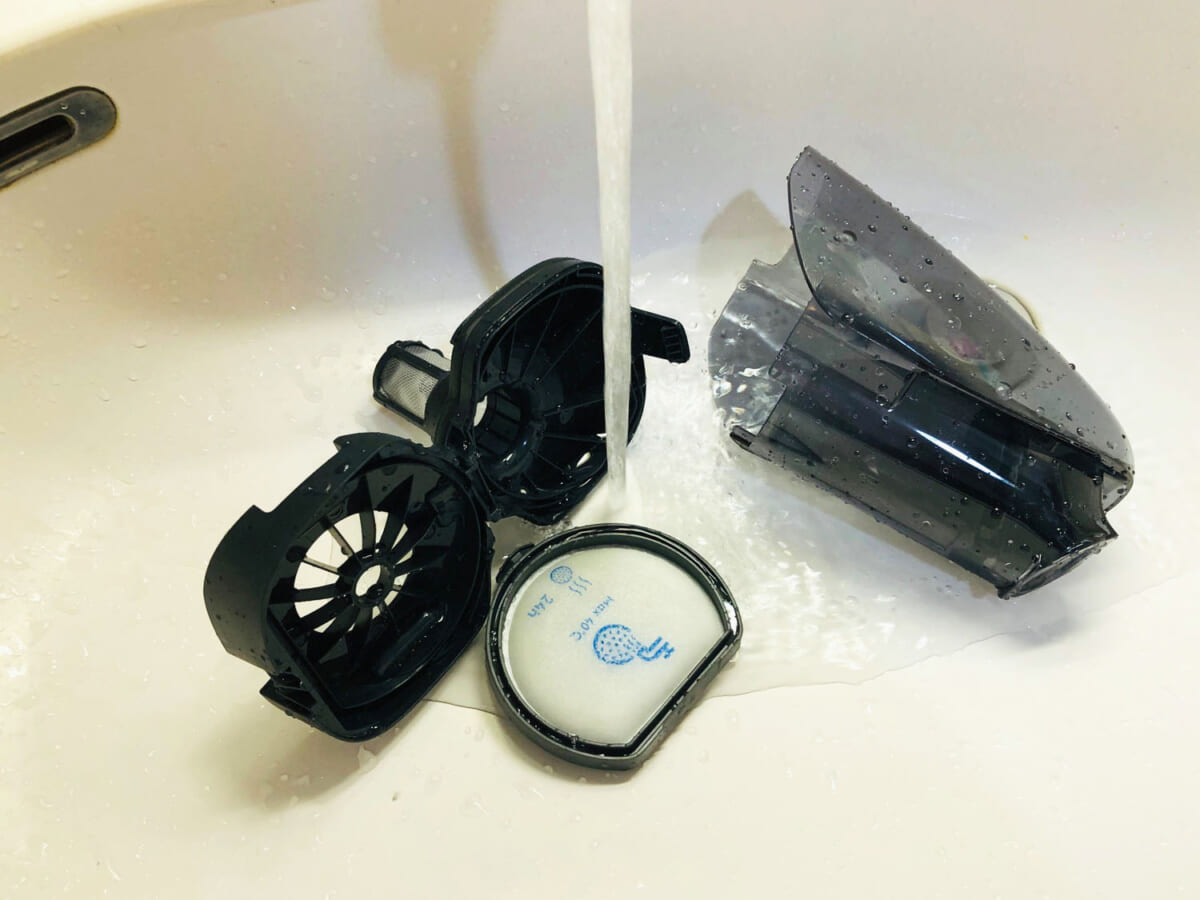 ダストケースの汚れやホコリがこびりついたときは、分解して水洗いも可能。排気については、メッシュフィルター、マイクロフィルター、排気フィルターなどによる「5段階フィルターシステム」により、0.3~10μmの微粒子を99.9%カットできるそうです。