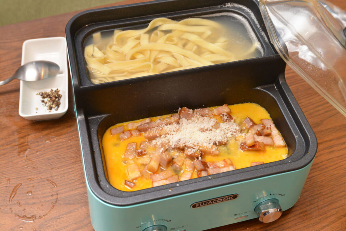 最後は「炒める&ゆでる」を同時に行って、カルボナーラを作ります。ソース作りに手間取っていたら、先にゆで上がっていた麺がのびて固まってる……なんていう失敗は「パスタあるある」ですが、本機を使えば、そんな心配はいりません。