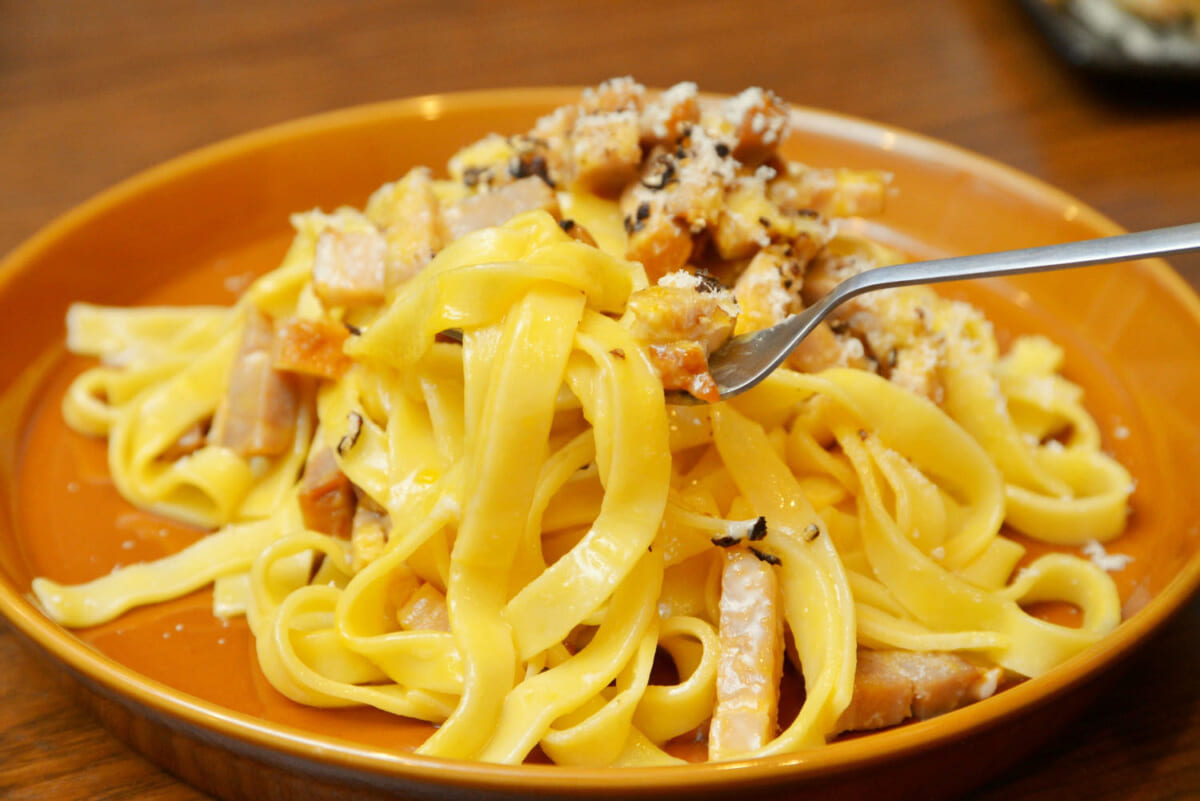 今回はより手軽に作るため、生クリームを使わないカルボナーラに仕立てましたが、充分にヴォーノ(ウマい)! ベーコン、チーズのうまみとコク、黒こしょうのアクセントが卵とうまくマッチしています。モッチリ系の麺との相性も絶妙。ワインが飲みたくなるおしゃれな味わいになりました。今回と同じ要領で、その他のパスタやあんかけチャーハンなども作れそうですね。