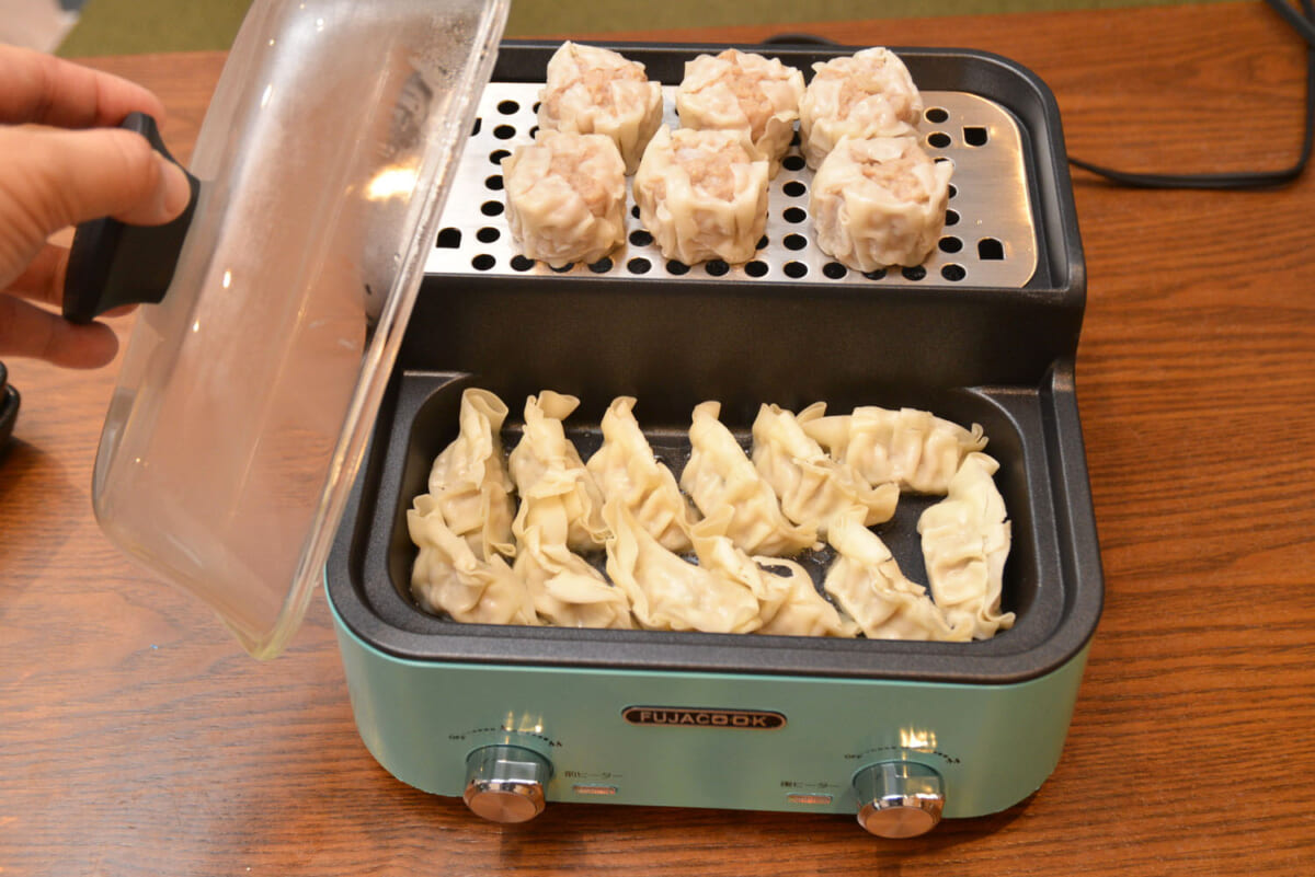 ここからは実際に調理していきましょう。まずは「焼く&蒸す」を同時に試すべく、中華料理の定番中の定番、焼き餃子と焼売を作ります。後ろ鍋には水を張り、オプションの蒸しプレートをセット。