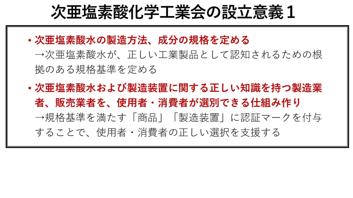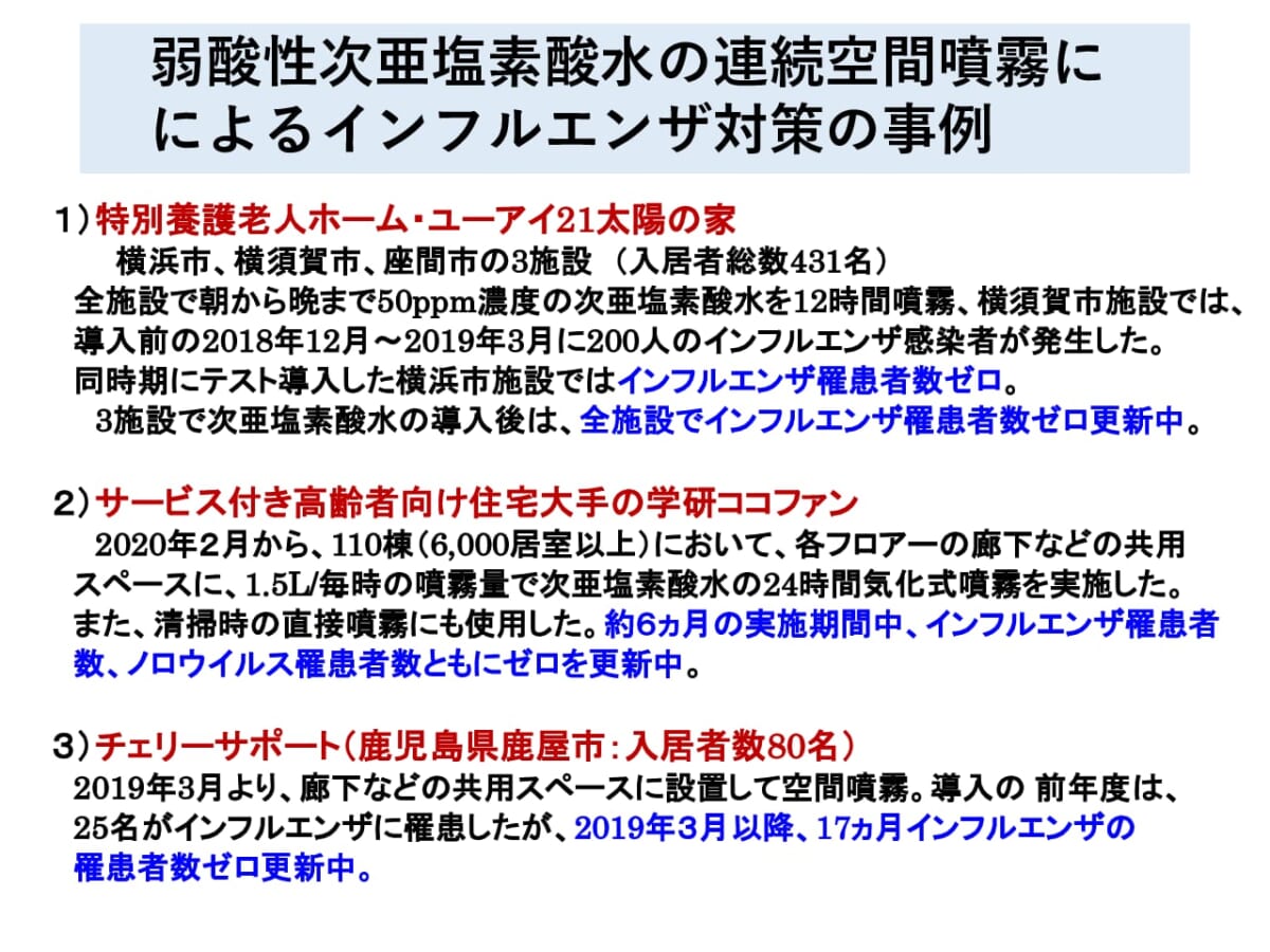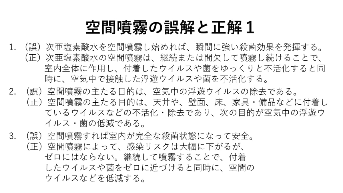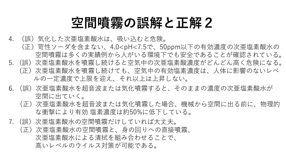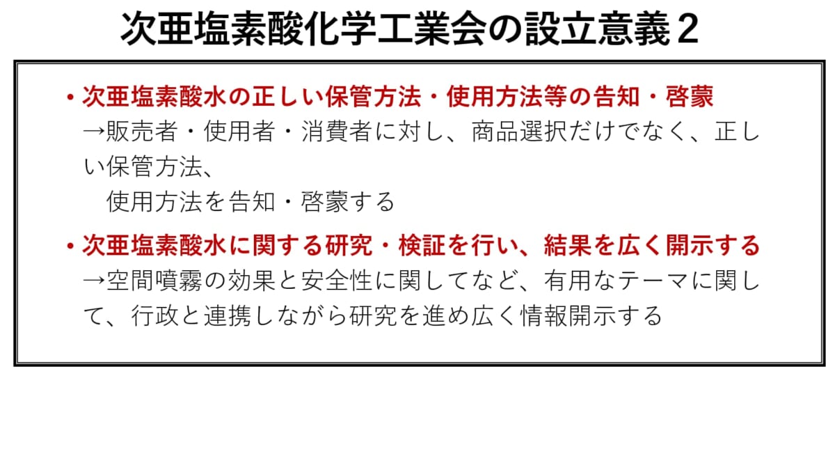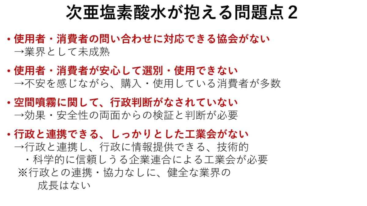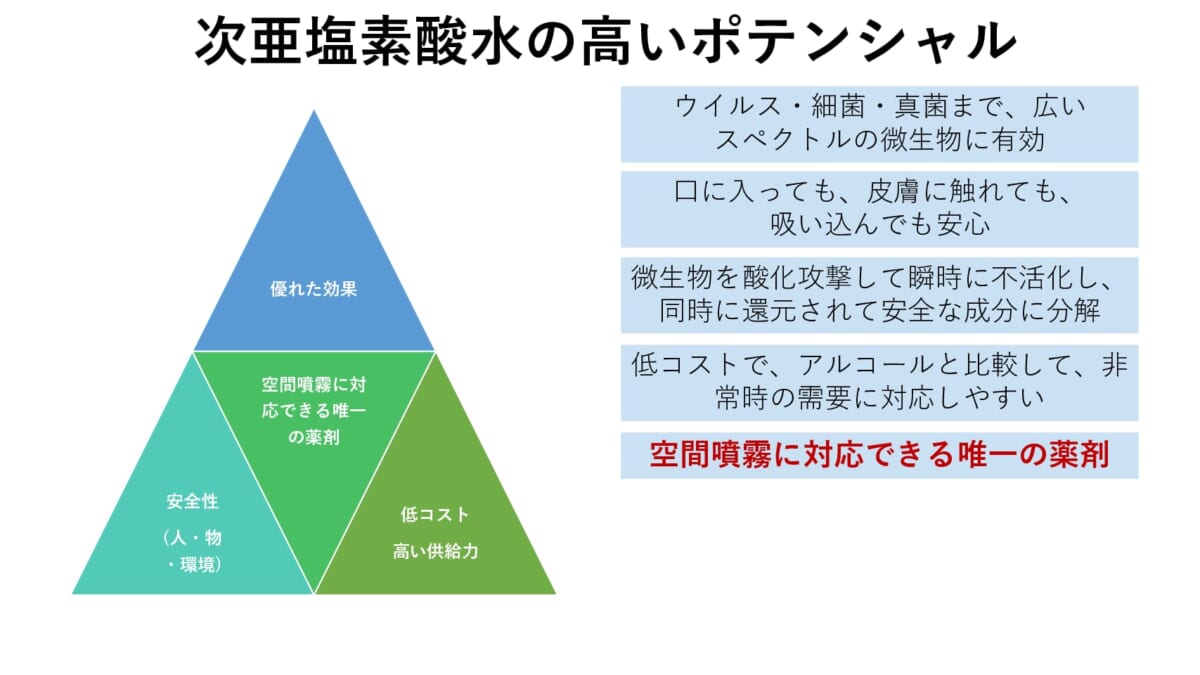 コロナ禍の早期収束は難しく、今後1〜2年は新型コロナウイルスと付き合っていくほかはなく、さらに秋が深まるとインフルエンザの心配も出ていきます。次亜塩素酸化学工業会が行政と連携し、空間噴霧に対して何らかのエビデンスが得られるのであれば、われわれの生活も少しは安心できるものになるでしょうか。同工業会の今後の活動に期待したいところです。