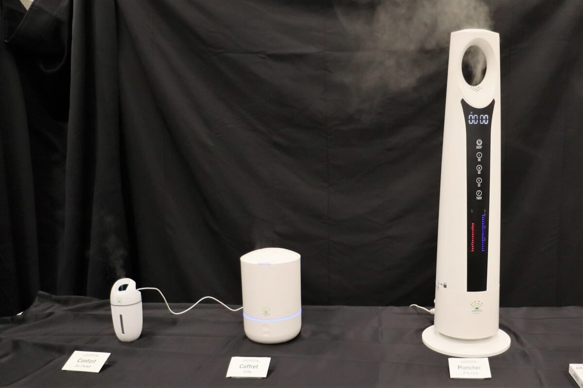 噴霧器の新製品は3タイプ。約30畳(約50平方メートル)用の「プランシェ」(タンク容量5L)は噴霧量を、弱30mL/h、中60mL/h、強90mL/hの3段階に調整できます。5Lの次亜塩素酸水を中モードで使用した場合、約83時間の連続運転が可能。約10畳(約16平方メートル)用の「コフレ」(1.2L)は弱15mL/hと強20mL/hの2段階で、強モードで40時間の連続使用が可能です。自動車内やトイレといった小空間用(約10平方メートル)の「コンフォルト」(200mL)は、弱10mL/hと強20mL/hの2段階。なおプランシェとコフレはACアダプター付属ですが、コンフォルトはUSB電源仕様となっています。
