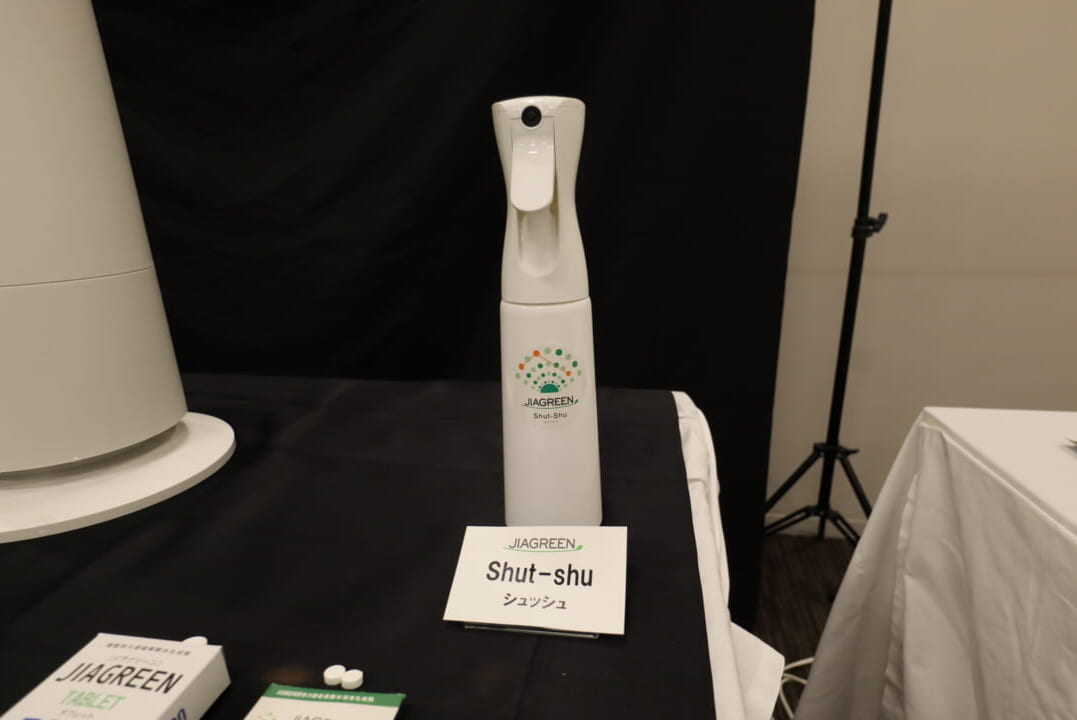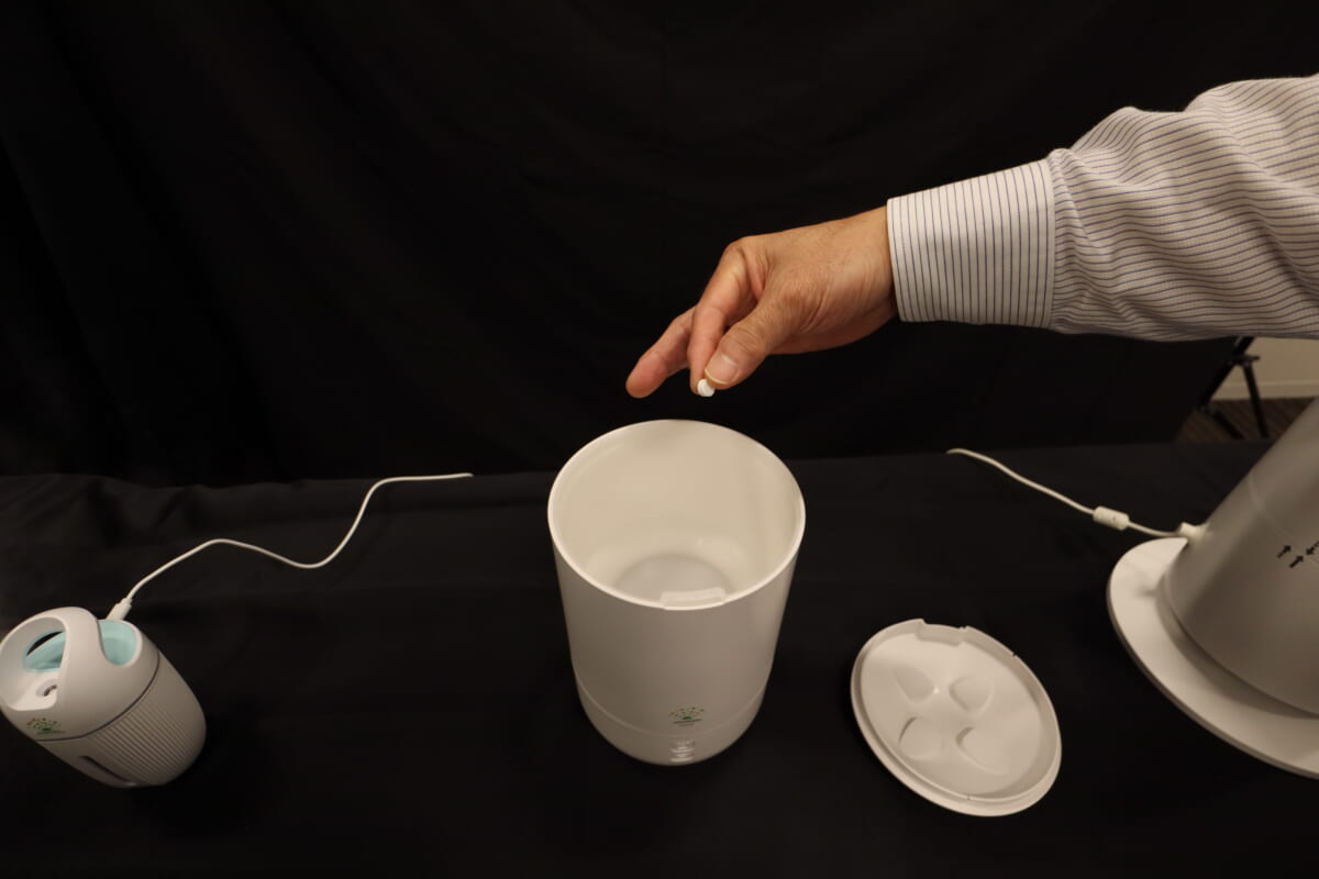 この日、工業会の賛助会員である次亜塩素酸水メーカーのグリーンウェルから、非電離型次亜塩素酸水空間除菌システム「ジアグリーン」の新製品発表も行われました。多くの次亜塩素酸水発生装置が電気分解型、または既に出来上がった次亜塩素酸水そのものを超音波加湿器で噴霧するのに対して、同社のジアグリーンはタブレット型の次亜塩素酸水生成剤(トリクロロイソシアヌル酸)を水道水で溶かし、専用の超音波噴霧器を使用して噴霧するのが特徴です。