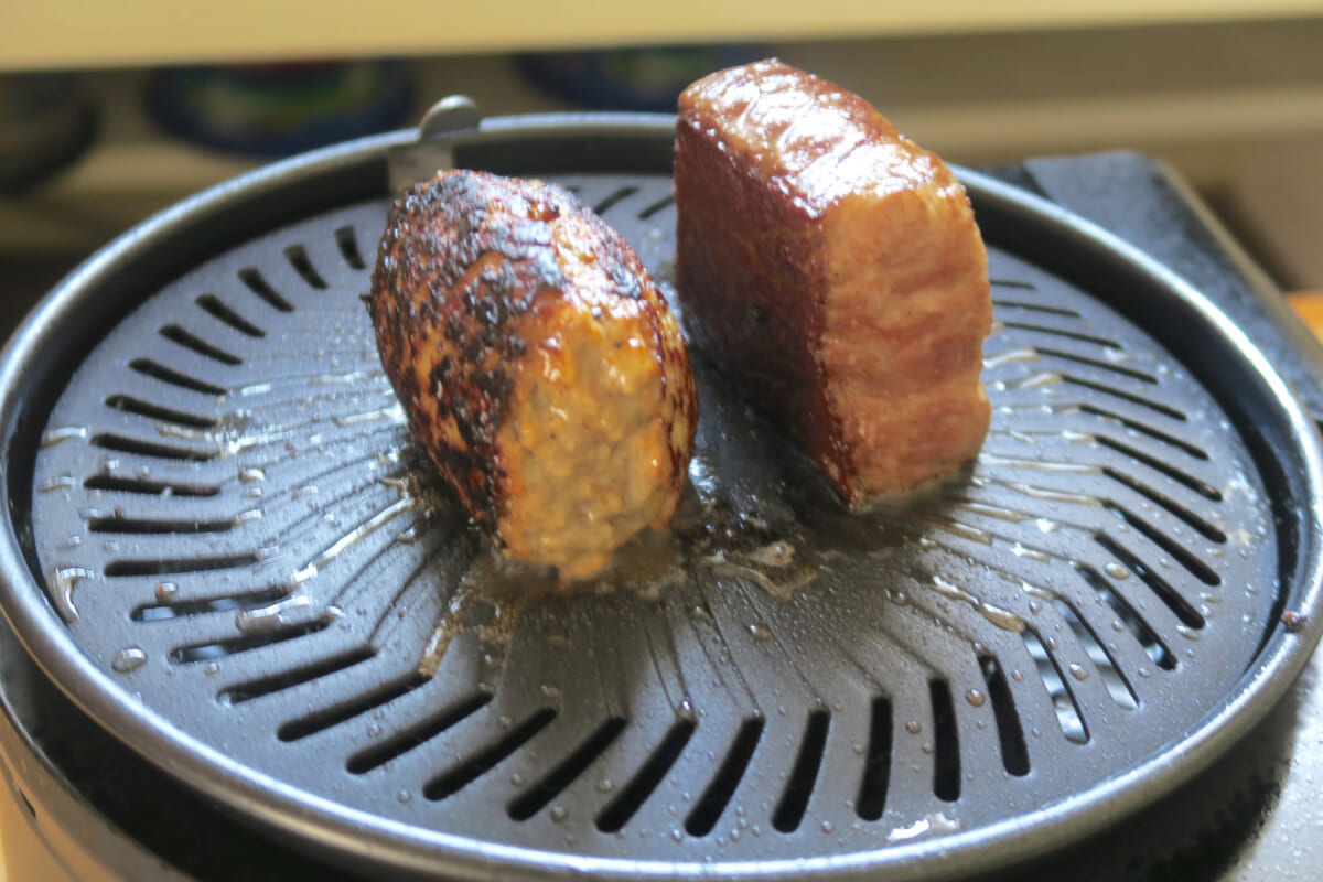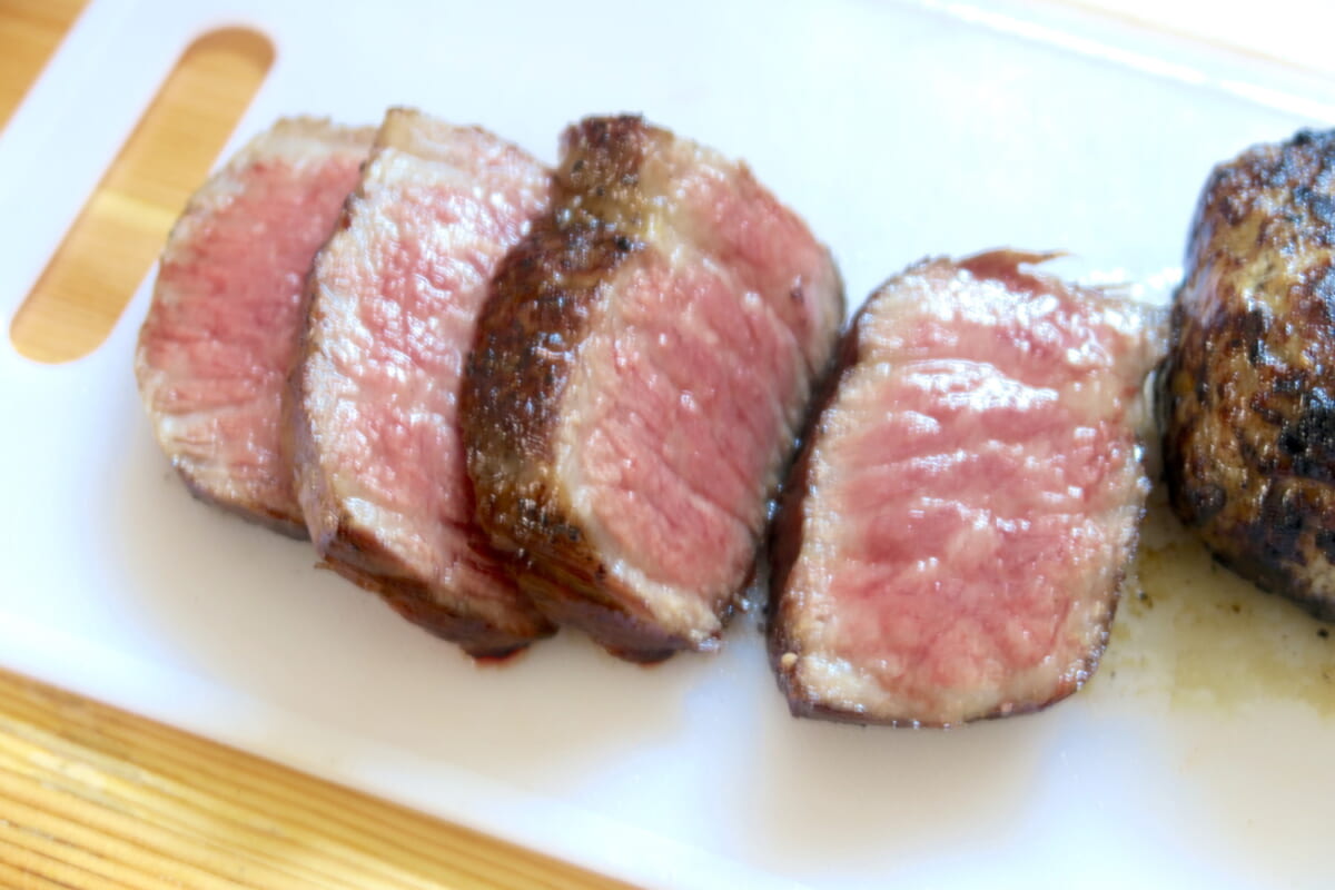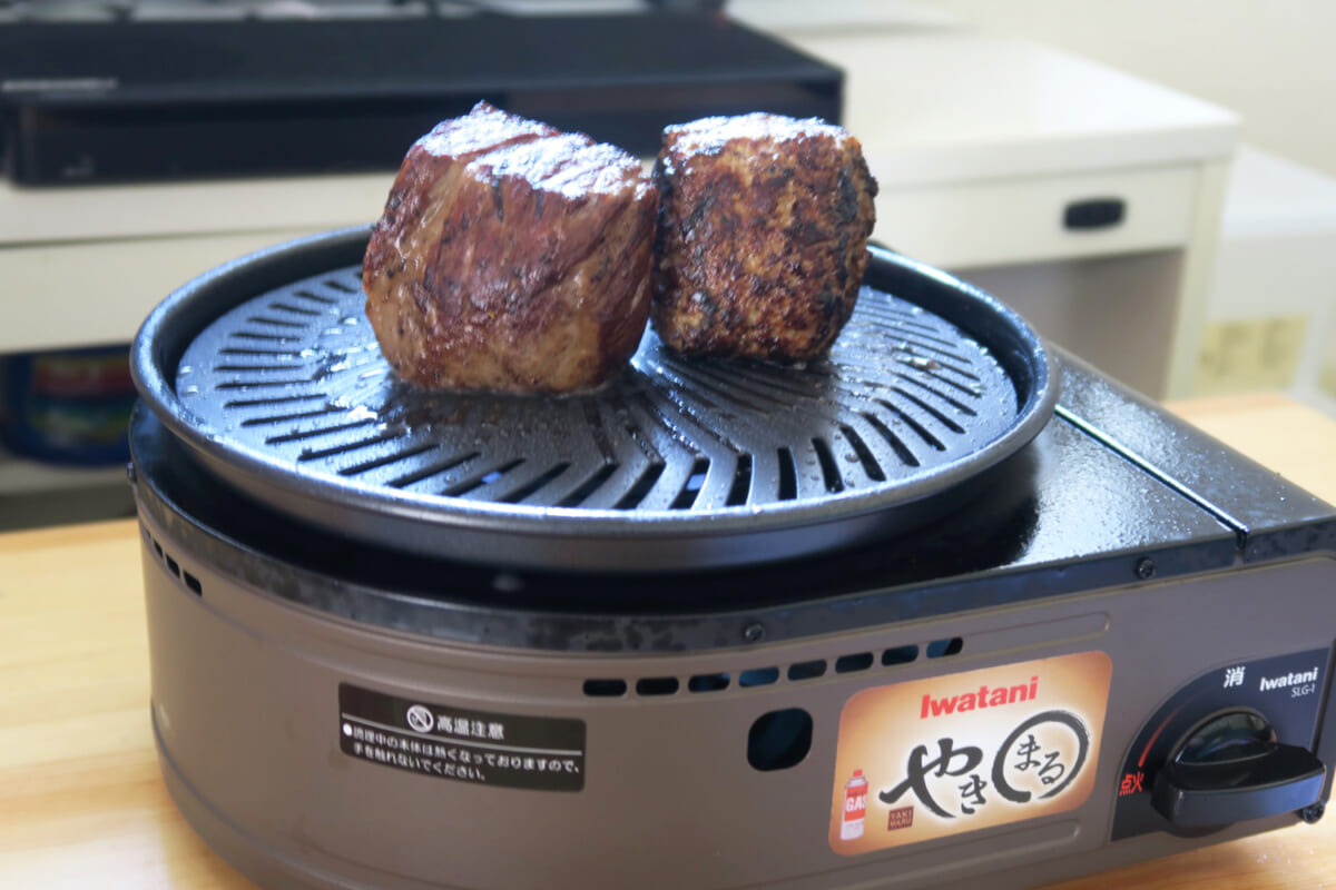 全体をまんべんなく焼き上げたらついに完成! 120gの霜降り肉の塊がこんなふうに焼肉プレートでフタもせずに本当に焼けているるのかが心配ですが、表面はしっかり焼けているので大丈夫なはず。塊肉を4等分にカットしてみたところ……美しいミディアムレアに仕上がっています!