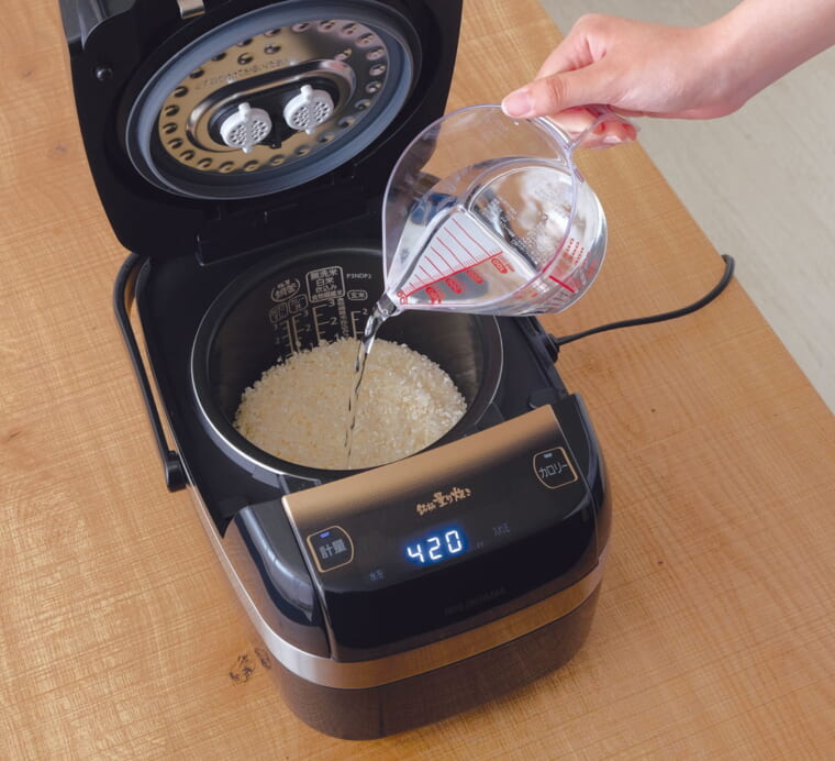 そんなアイリスの炊飯器の代名詞が「銘柄量り炊き」機能だ。これは米の量と銘柄に合わせて最適な水量を量るというもの。米は銘柄によっておいしく炊ける水量が驚くほど異なるのだという。