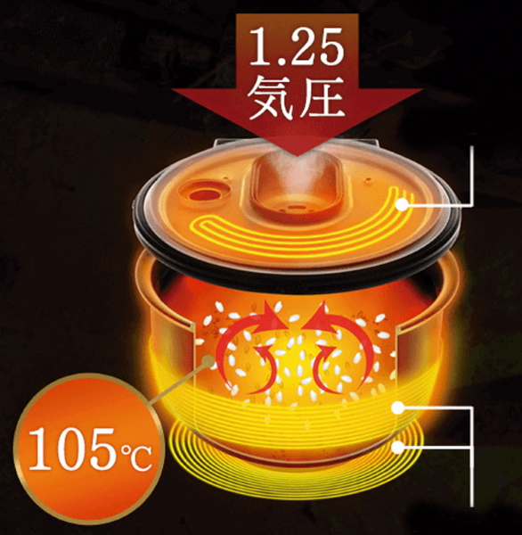 圧力炊飯とIHの高火力により、冷めてもおいしいもちもち食感に。40種類の銘柄量り炊き機能、冷凍ごはんモードなどのこだわり炊き分け機能、ごはんのカロリー表示機能を搭載。